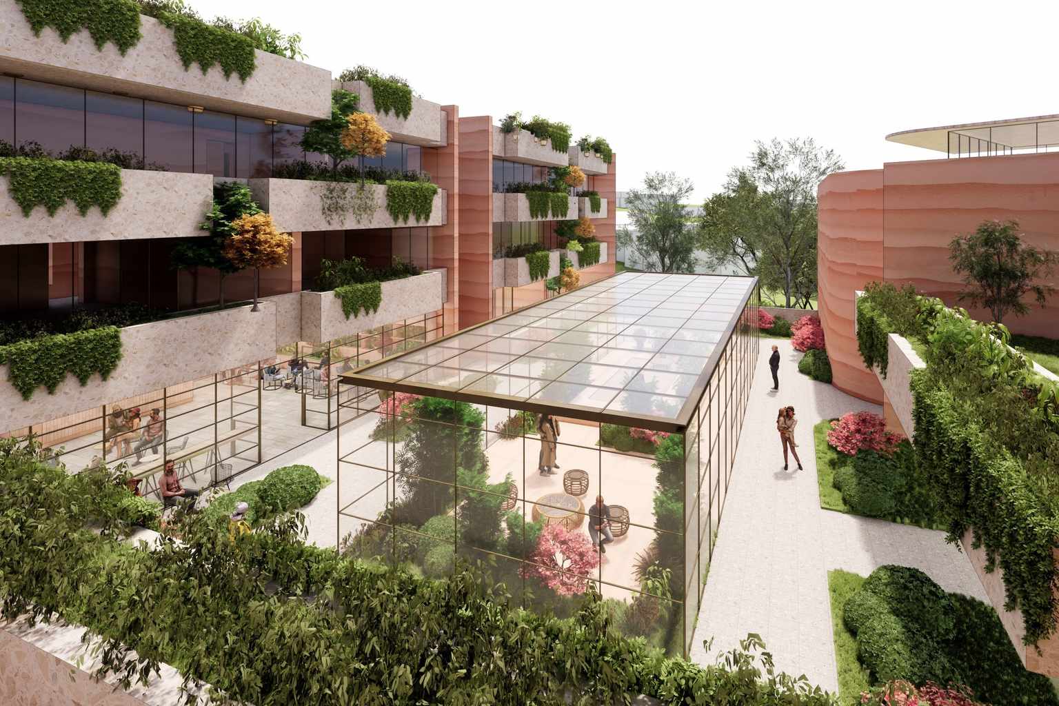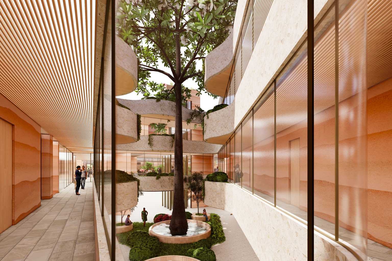 Woods Bagot has designed the building in three wings separated by landscaped spaces, featuring a village green, a greenhouse pavilion and rooftop gardens.