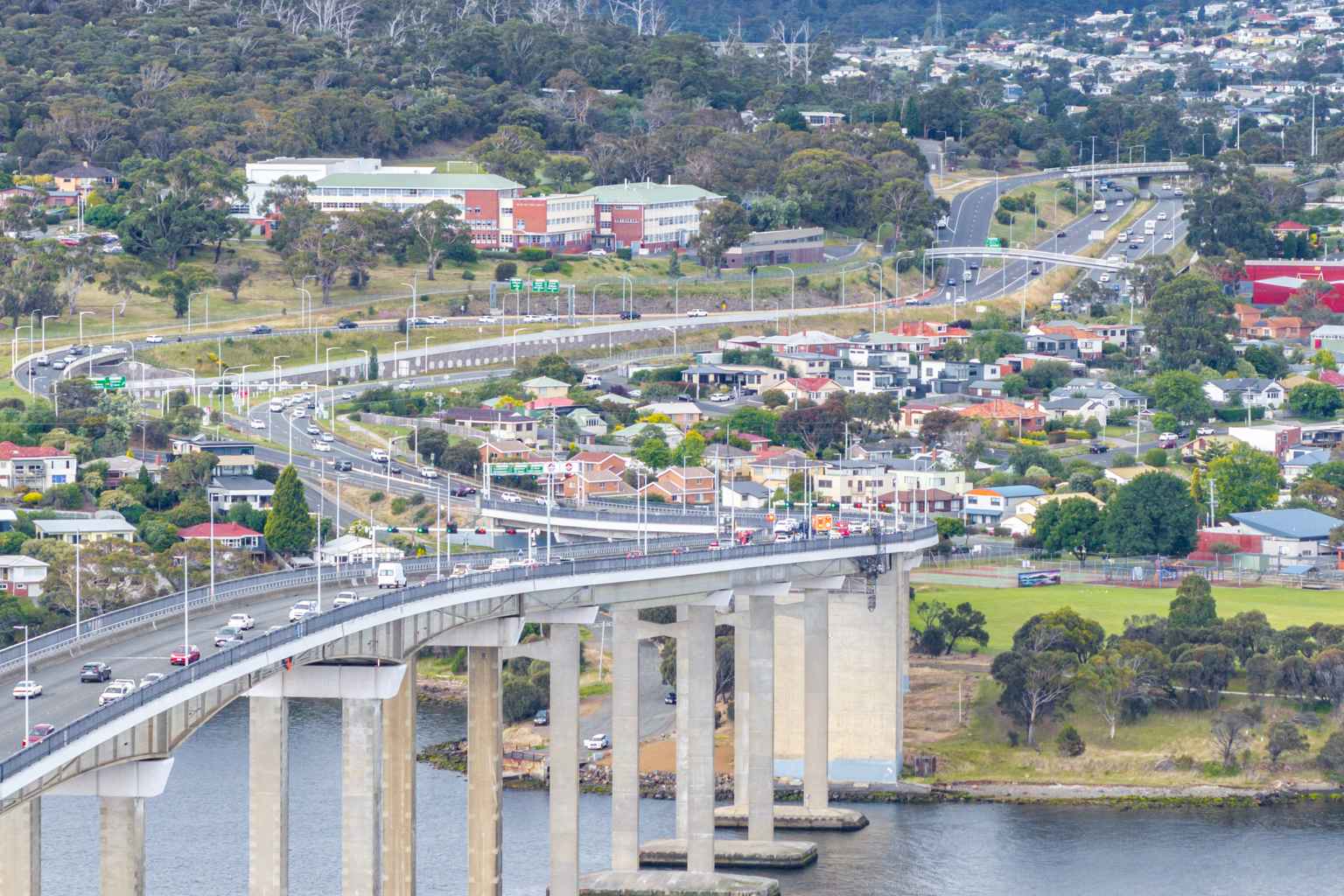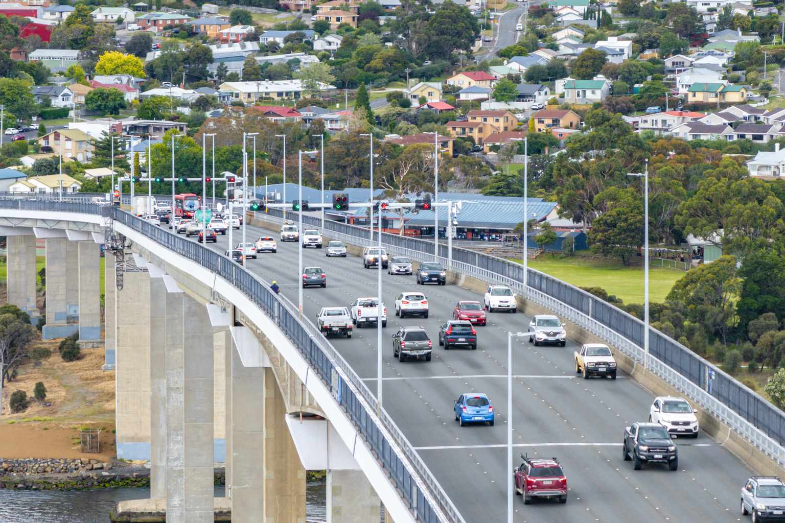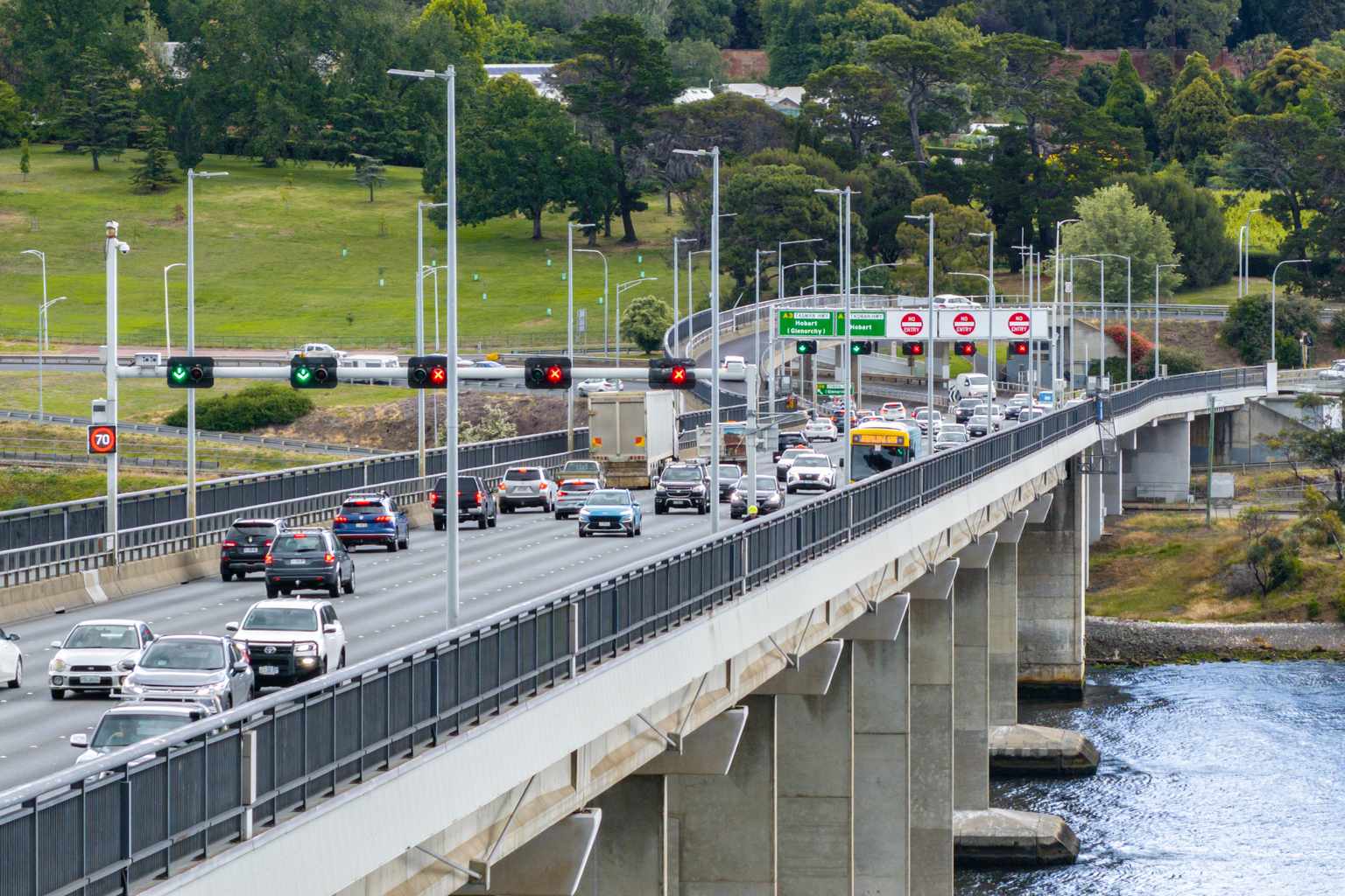 But during weekday morning peaks, the middle lane switches direction to help city-bound traffic – leaving just one lane heading back out of Hobart.