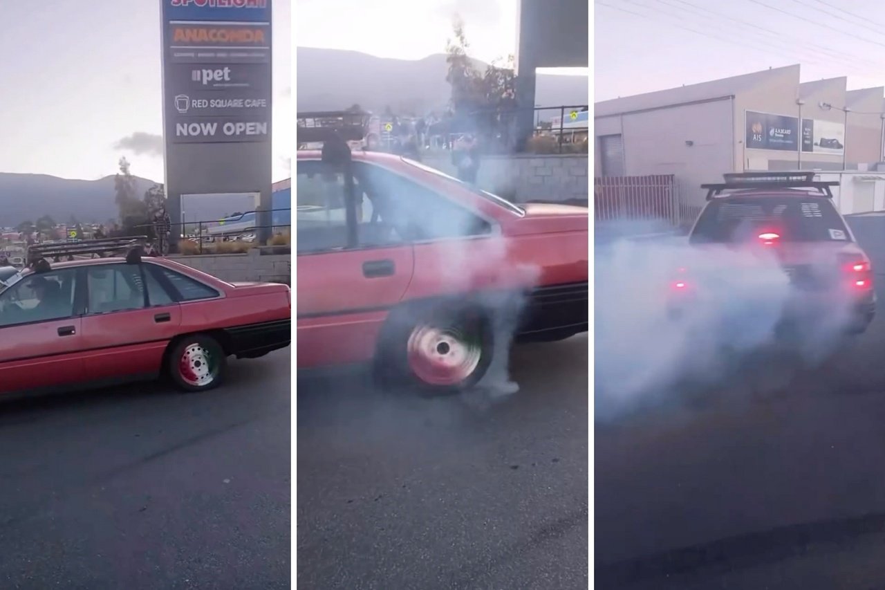 A driver in a car displaying red P-plates has had the vehicle seized after performing burnouts across both lanes of a road in Hobart’s northern suburbs, as spectators filmed the dangerous stunt.