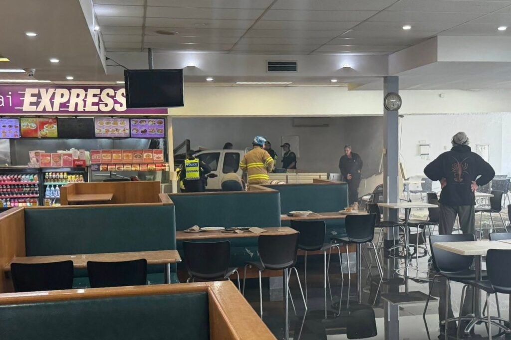 Earlier: A ute has crashed through the front of a Launceston food court, ploughing through tables and chairs before coming to rest in the middle of the venue.