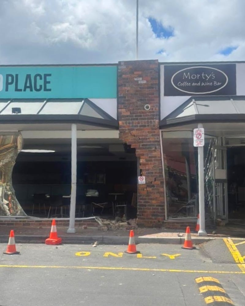 Photos from the scene show significant damage to the front of the building, with debris strewn across the dining area.