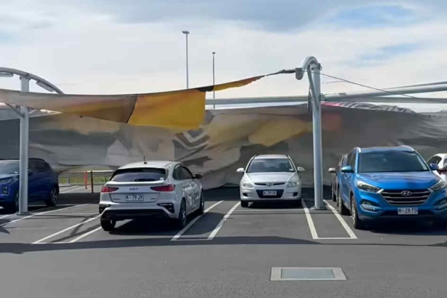 Shoppers watched in shock as the sail cloth billowed above the car park before coming down on approximately eight vehicles.