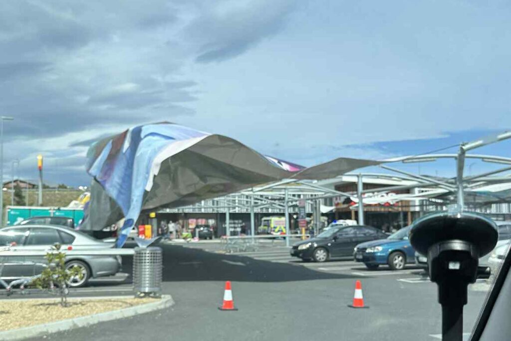 Emergency services rushed to Glebe Hill Village in Howrah around midday after the large shade structure was torn off by powerful gusts.