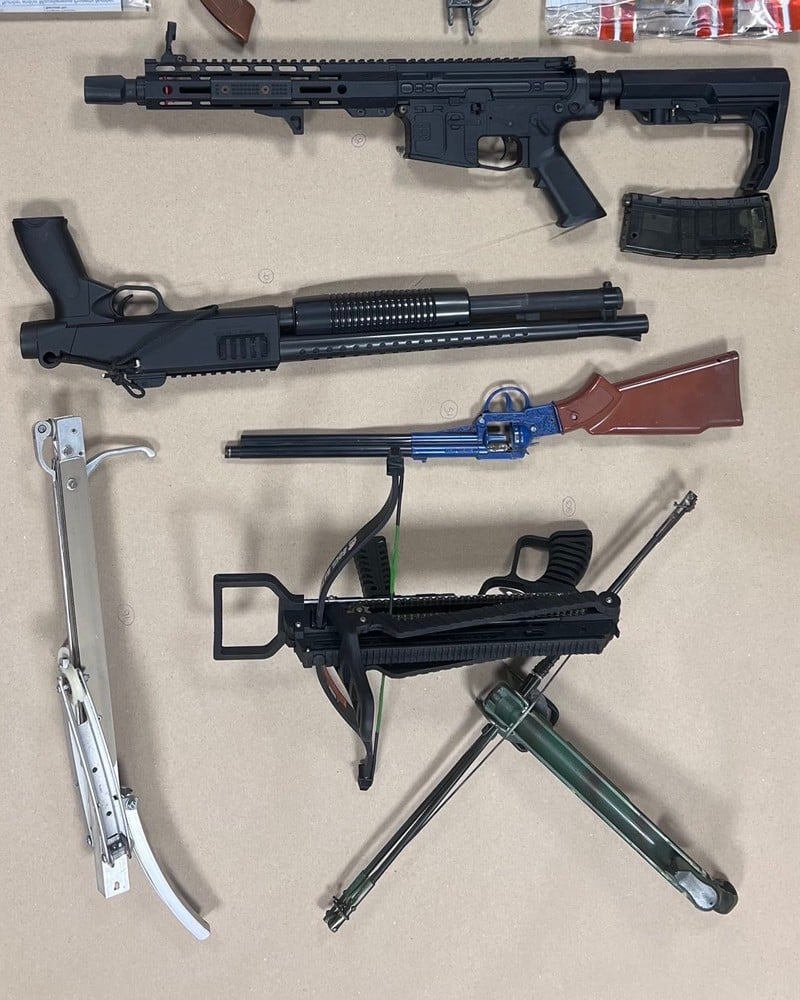 The haul included a sawn-off shotgun, a rifle, six homemade pistols, an antique pistol, two gel blasters and two crossbows – one of them also homemade.