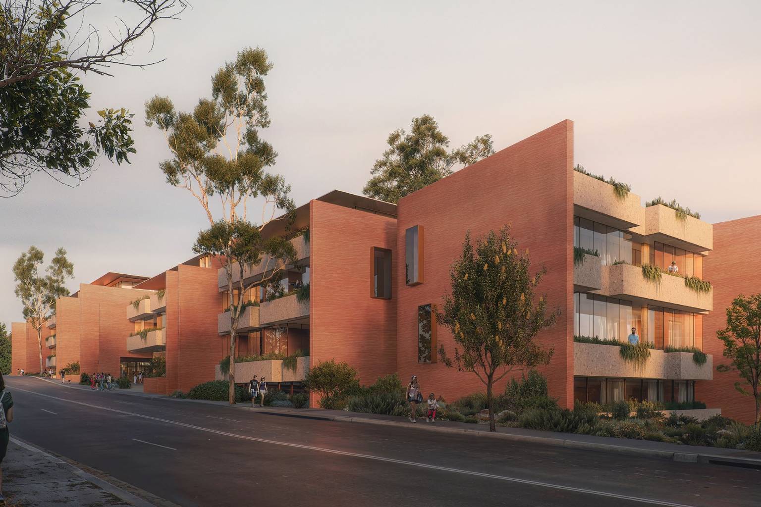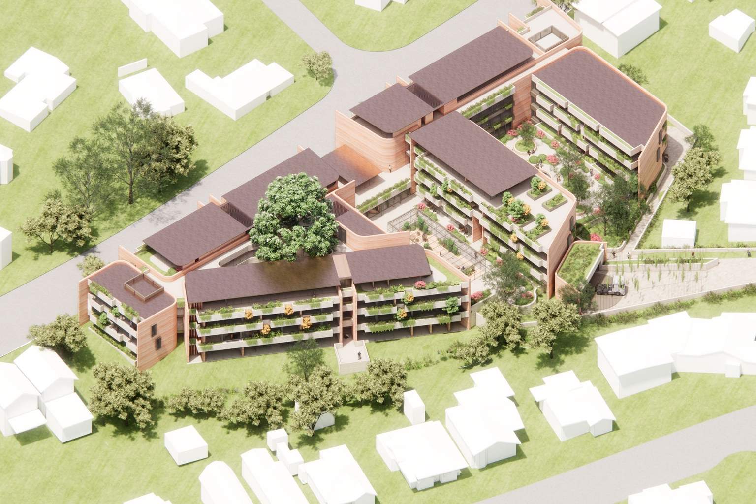 The development will feature six interconnected buildings with landscaped areas, including a village green and rooftop gardens.