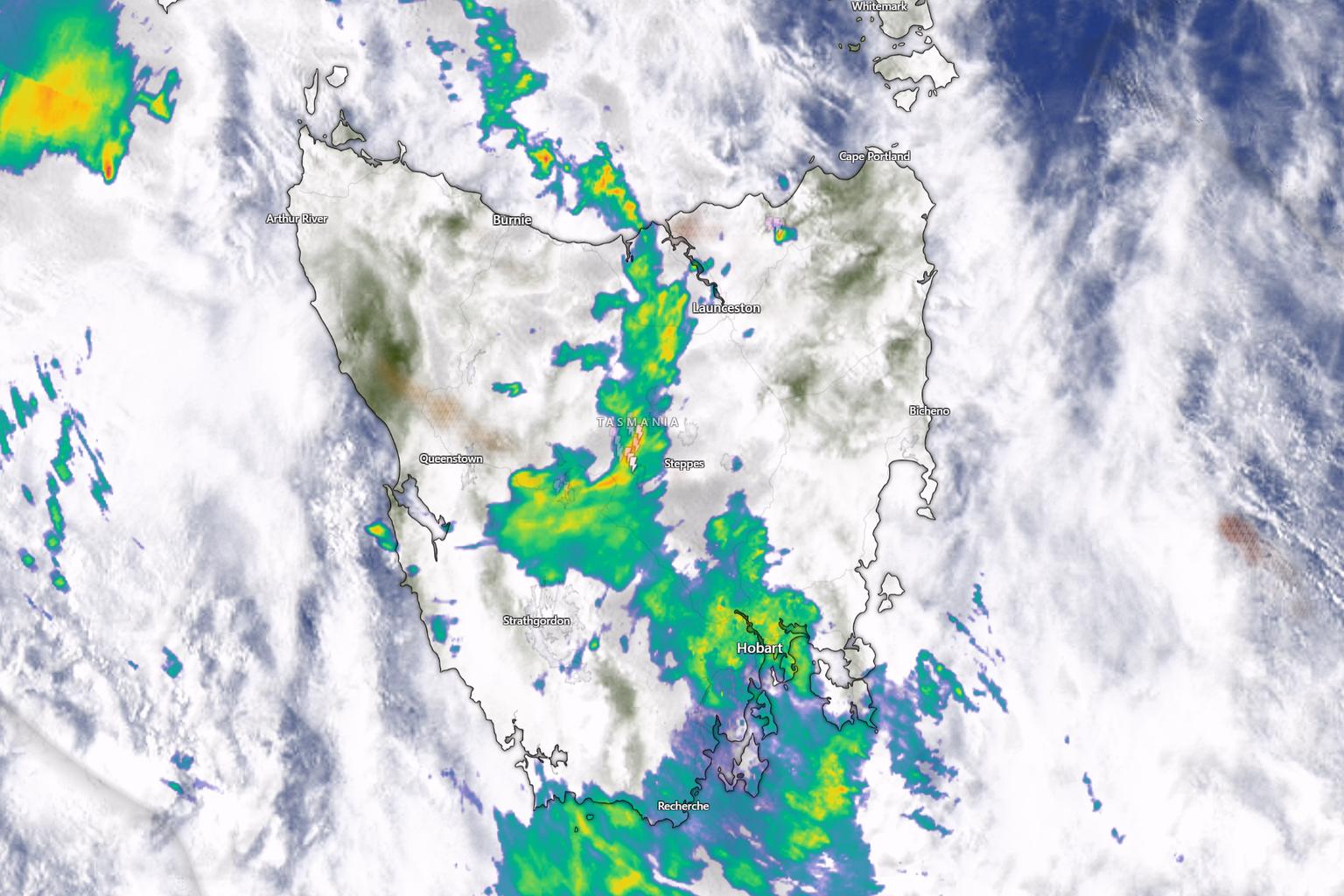 Thunderstorms are possible across much of Tasmania except the far south, with rain expected to ease and contract eastward this evening.