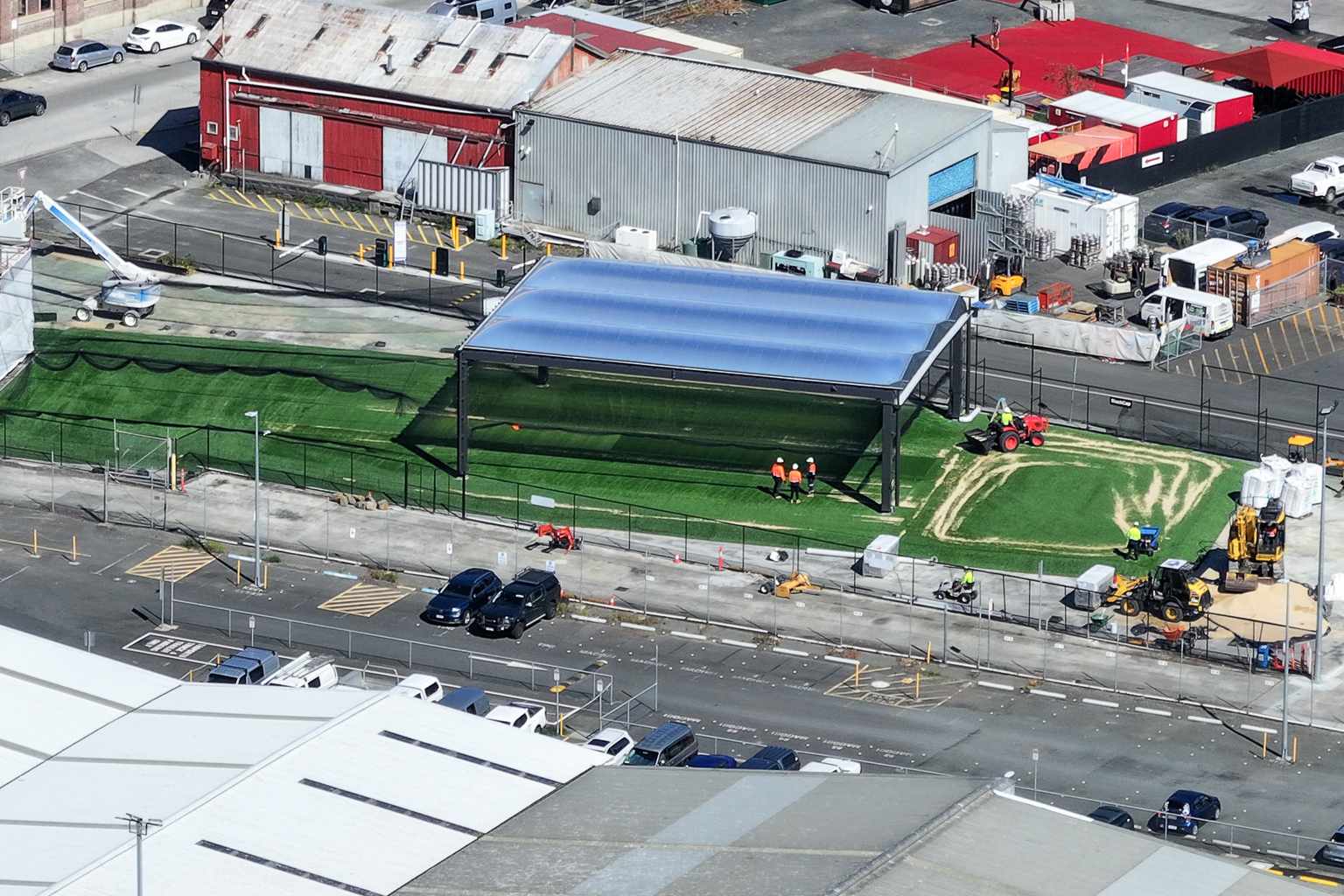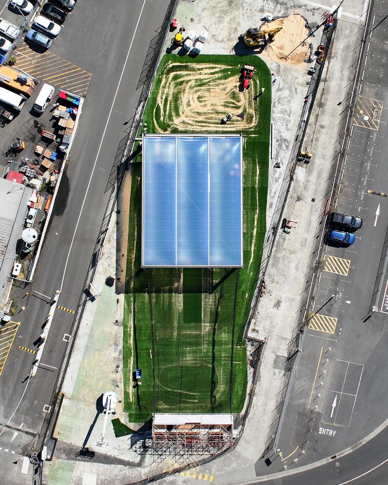 The rig simulates the roof structure of the proposed $1.13 billion Macquarie Point stadium and will assess how the translucent ETFE roof material manages shadows and sunlight on the playing surface.