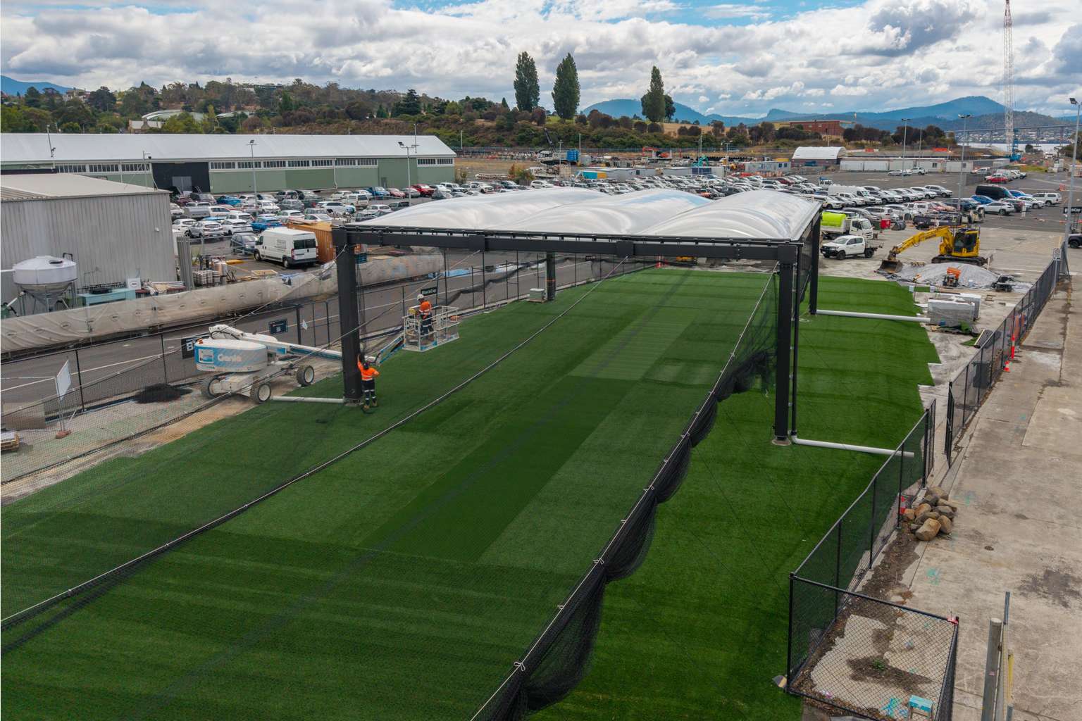 A test rig designed to determine whether cricket can be played under a roofed stadium has been completed at Hobart’s Macquarie Point, with cricketers set to begin testing this week.