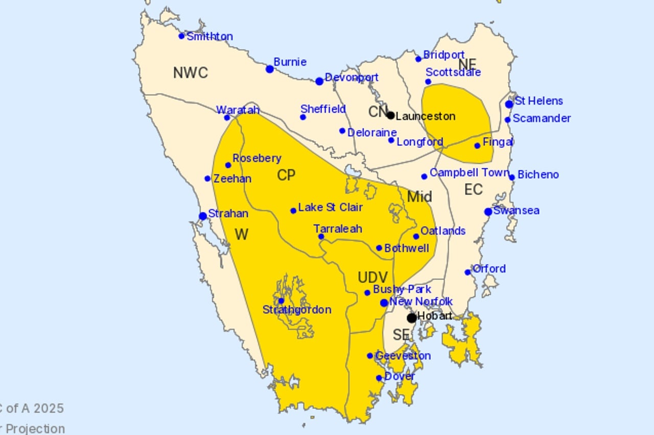 Towns in the firing line include New Norfolk, Oatlands, Whitemark, Bothwell, Geeveston and Dover.