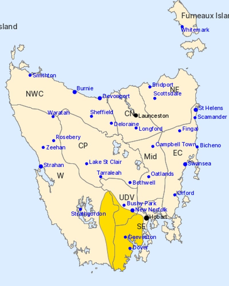 The Bureau of Meteorology has issued a severe weather warning for parts of the Western, Upper Derwent Valley and South East districts.