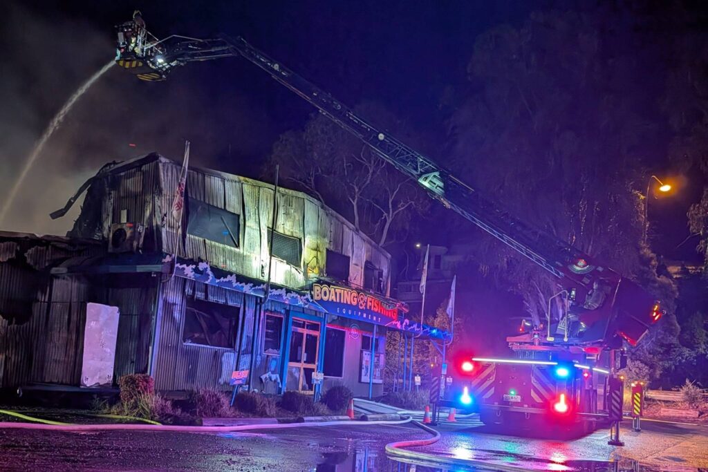 30 firefighters battled the blaze for about two hours before bringing it under control, but flames had already spread to adjoining business Almasts Australia and a slipway warehouse.