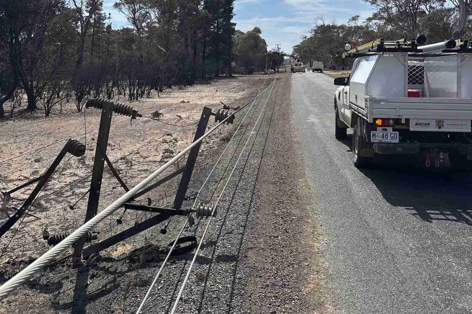 The blaze has also caused major damage to power infrastructure, with TasNetworks confirming at least 40 power poles and several transformers have been destroyed or damaged.