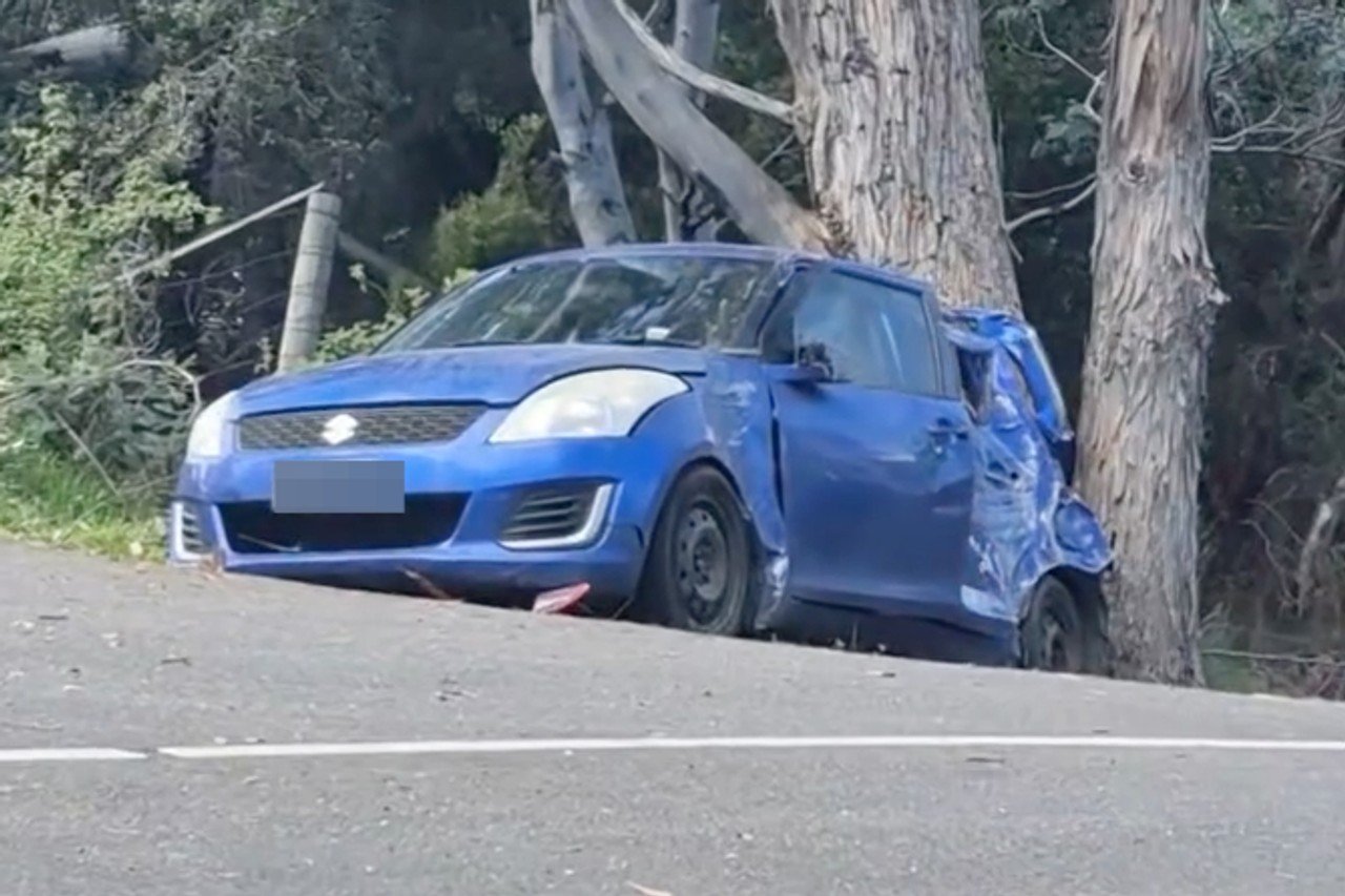 The Suzuki sustained severe damage to its rear and left side, where it appears to have struck the tree.