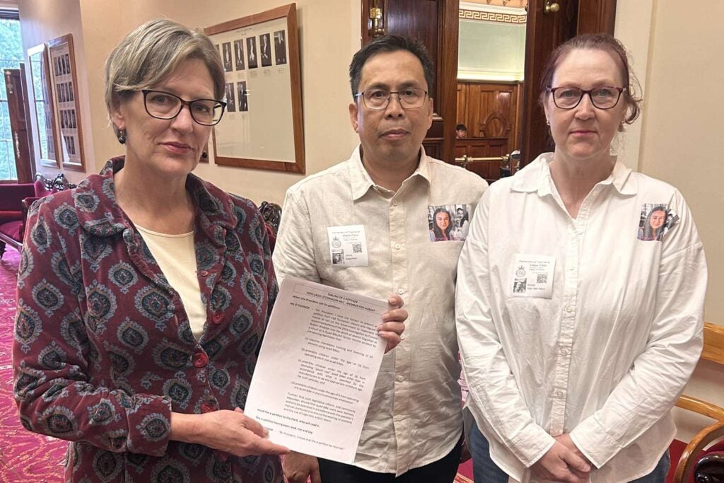 The petition, signed by 419 Tasmanians, was presented by Greens MLC Cassy O’Connor alongside Sonia van den Heuvel and Julius Daguman.