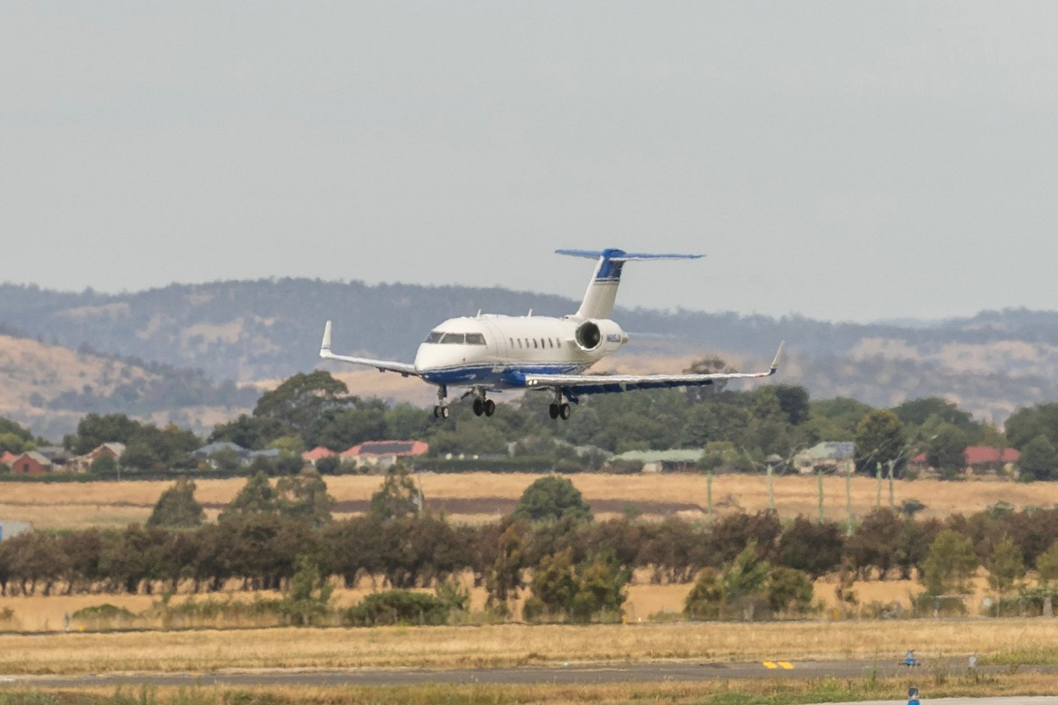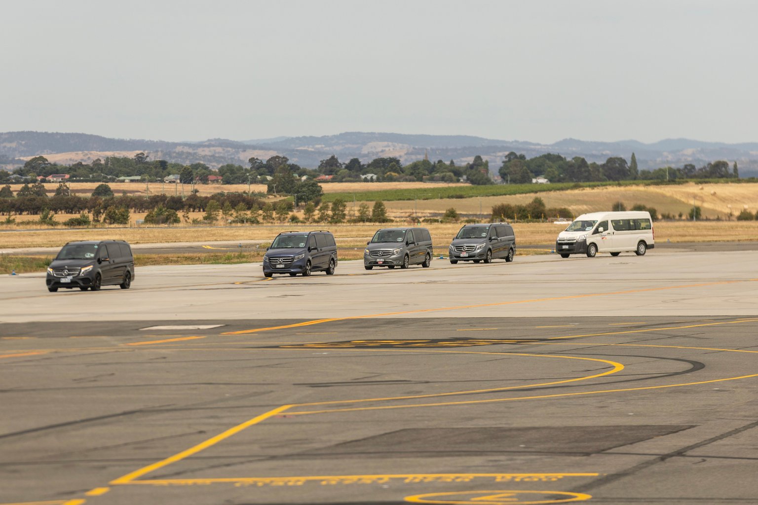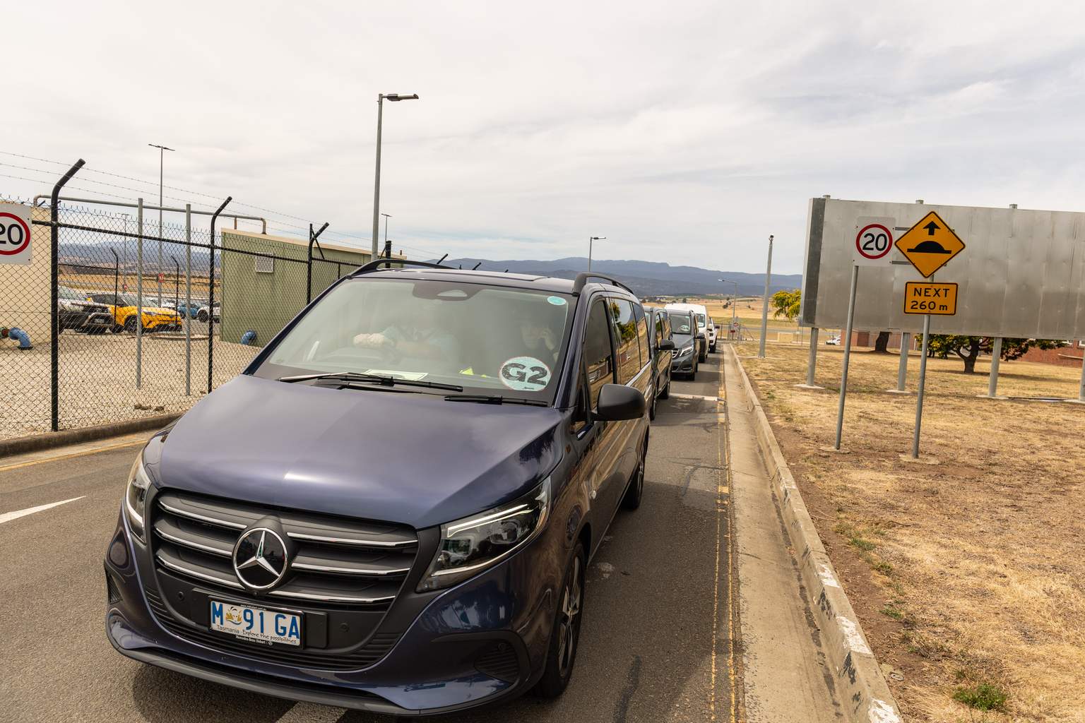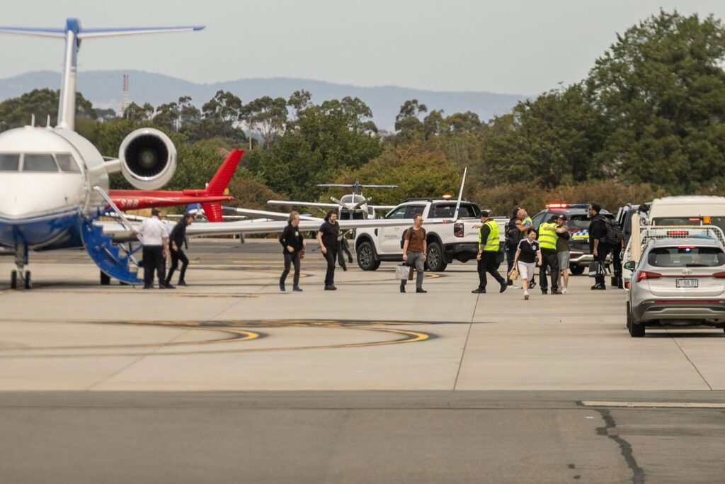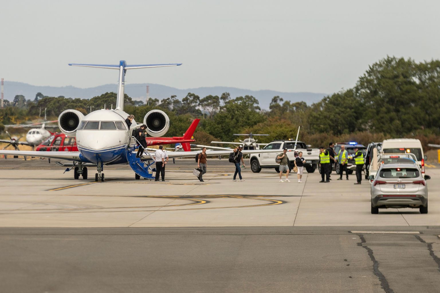The band touched down at Launceston Airport just after 2pm this afternoon, disembarking from their private jet before being whisked away in four black vans with a police escort.