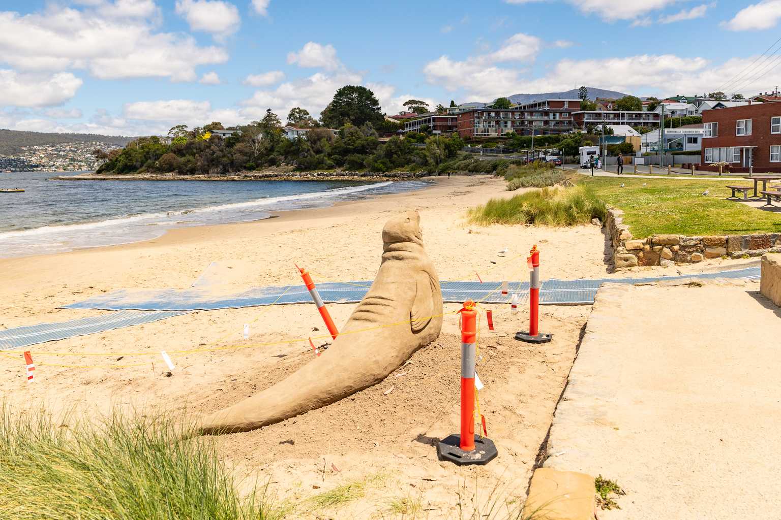 A giant sculpture of Tasmania’s famous ‘Neil the seal’ has appeared at Bellerive Beach on Hobart’s eastern shore.