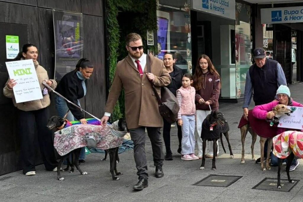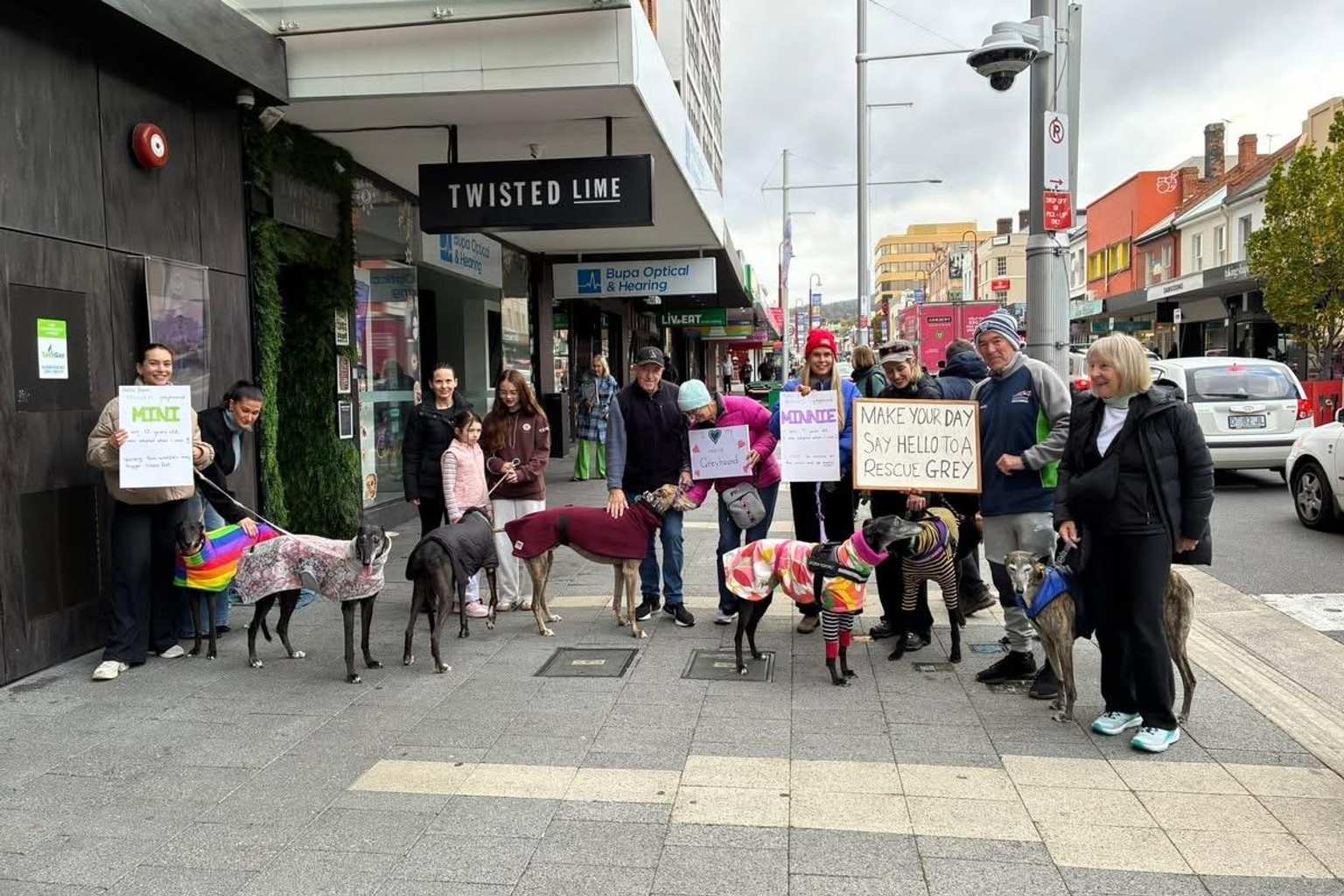 Protesters against greyhound racing and their rescue dogs turned up outside Tasmania’s state Labor conference on Saturday, greeting delegates with pats and conversation.