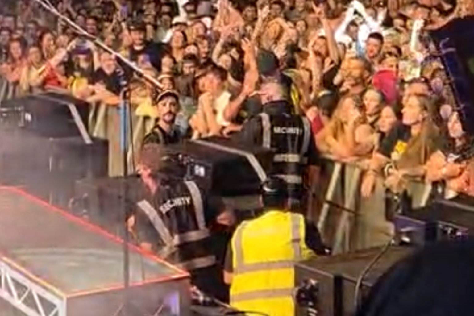 The extraordinary moment occurred during the band’s hit “Lost Control” when Jamieson spotted a security guard attempting to remove a female attendee from the front of the crowd.