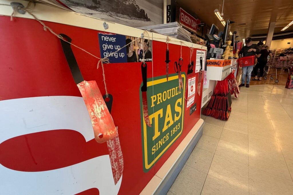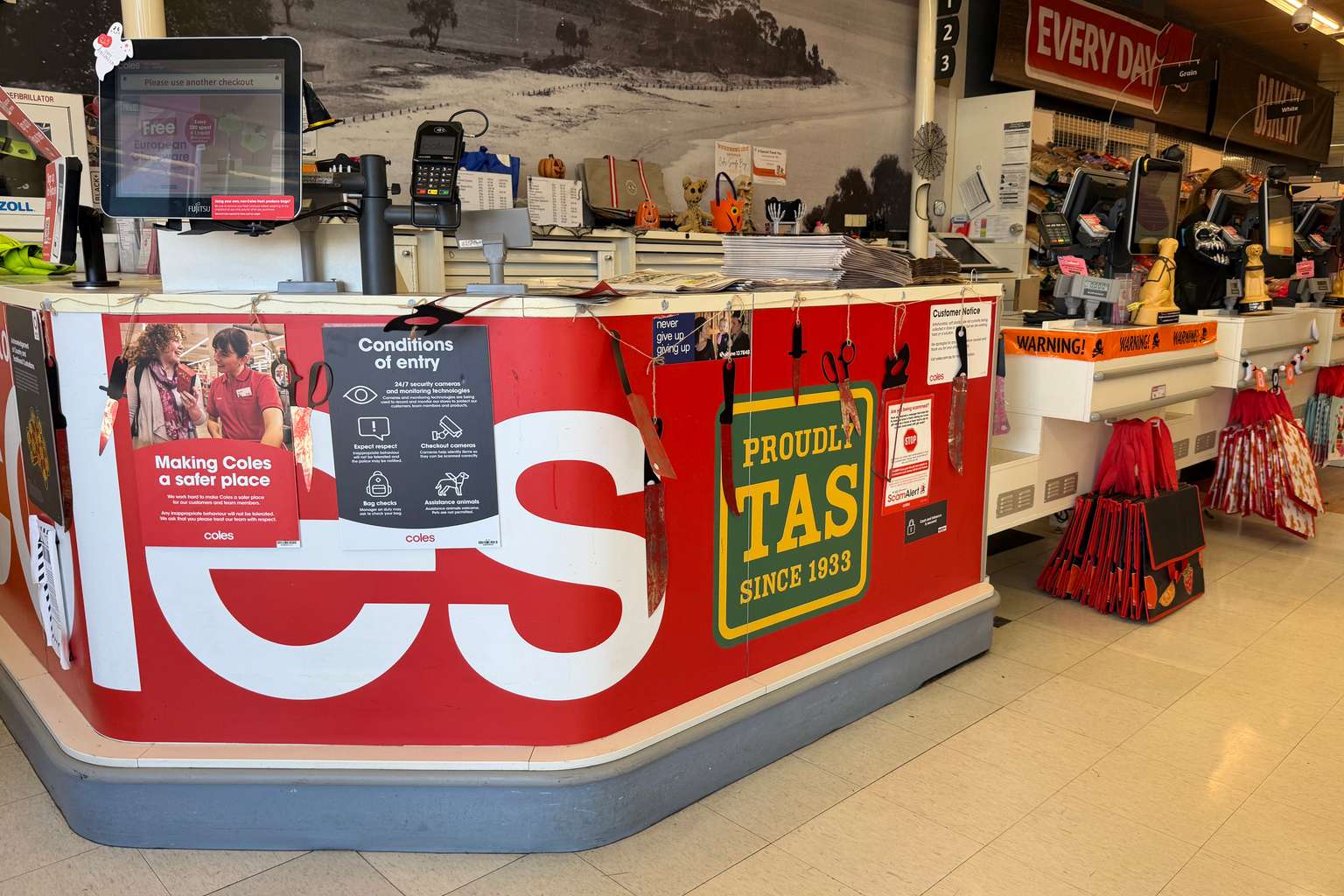 Coles has apologised and removed a Halloween display featuring fake blood-covered knives from its Sandy Bay store, days after a fatal stabbing on the Hobart waterfront left a young man dead.