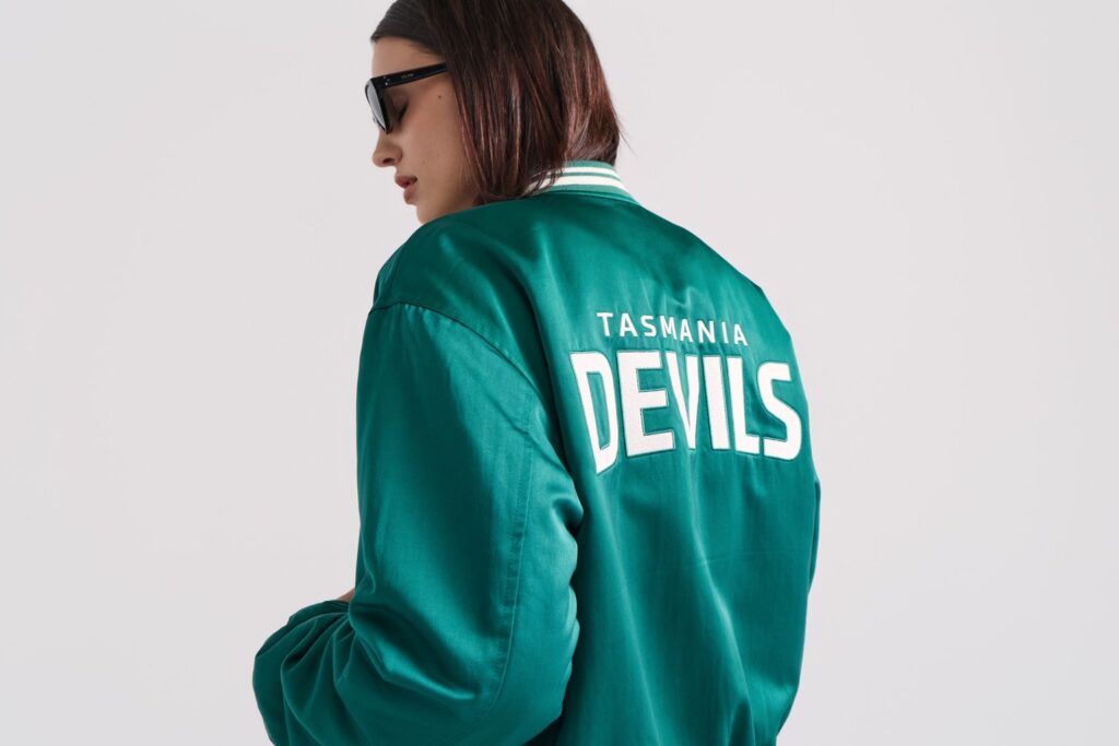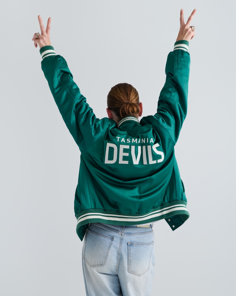 Emma Petterwood’s brand Romy has worked with the Tasmania Devils on lifestyle merchandise, with the bomber jacket being the first true collaborative piece between the AFL club and the female-led Tasmanian brand.