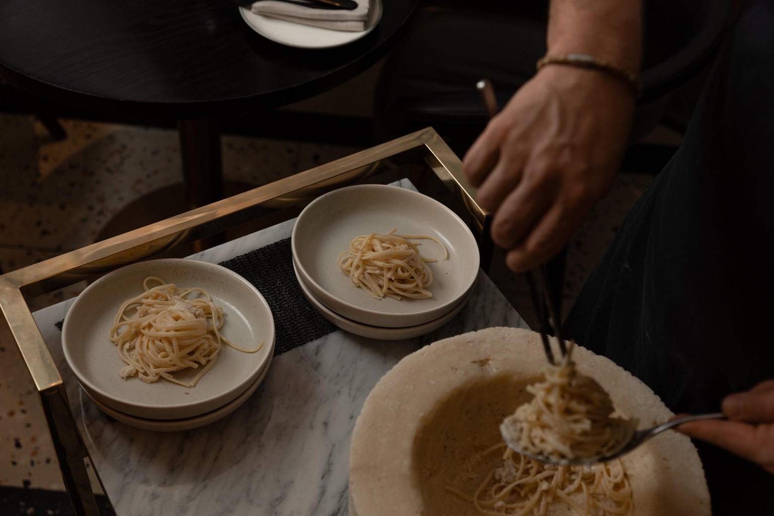 The tableside preparation involves bringing freshly made linguini to diners, where chefs toss it inside the cheese wheel, allowing the pasta’s heat to melt the pecorino and create a creamy coating.