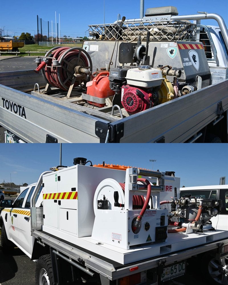 Each unit combines a 450-litre water tank, high-pressure twin-impeller pump and electric hose reel in a compact setup that can turn a standard 4WD into a mobile firefighting rig.