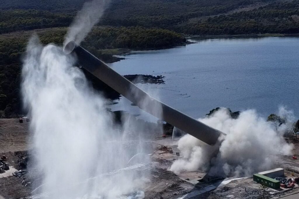 The 110-metre chimney stack at Tasmania’s former Bell Bay Power Station has been brought down in a controlled blast.