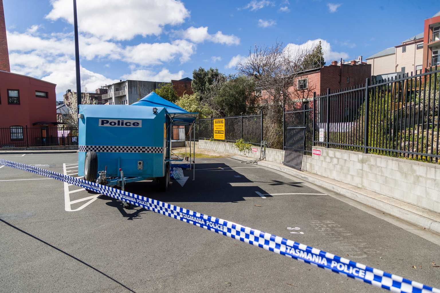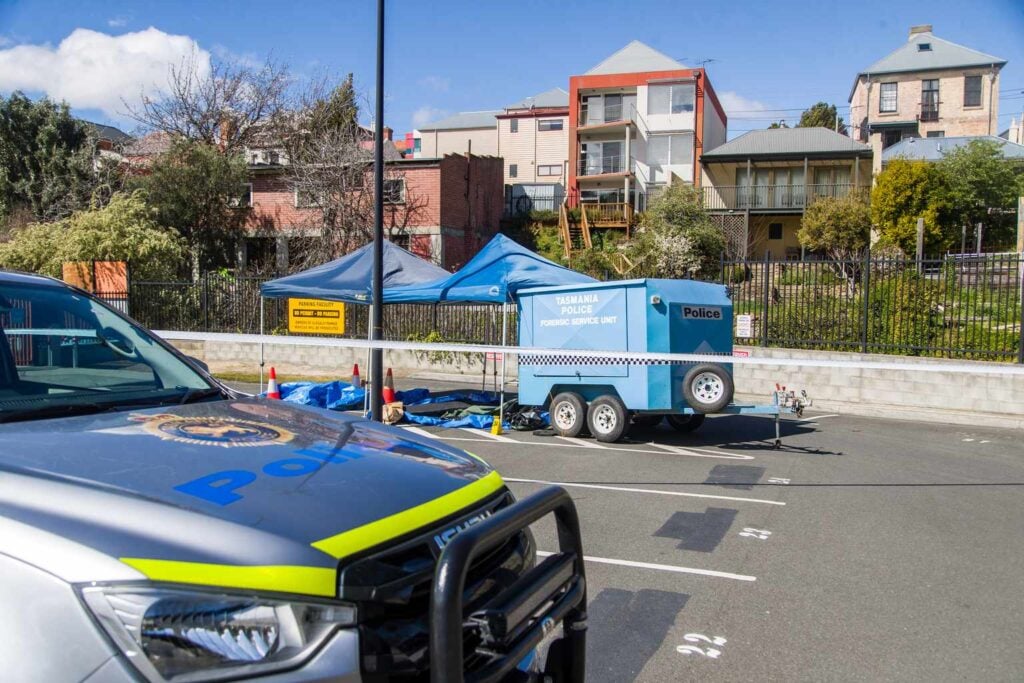 Police have cordoned off a section of the Hobart Rivulet after a woman’s body was discovered “semi-naked” submerged in the water.
