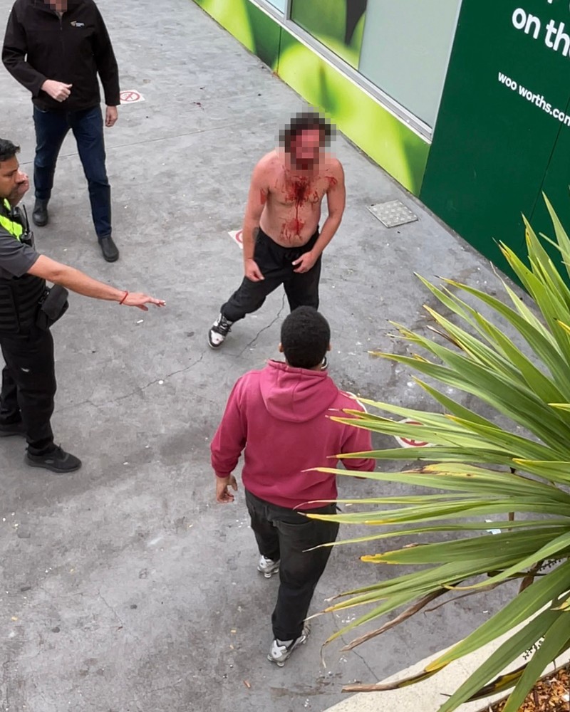 Images taken shortly after showed him shirtless, with blood covering his face and chest, as he spoke with a security guard from the Eastlands shopping centre.