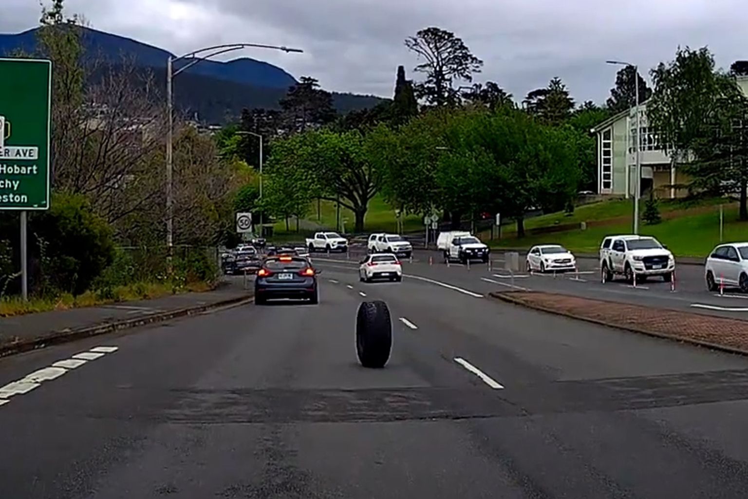 A runaway tyre rolling at high speed down one of Hobart’s busiest streets in peak-hour traffic has sparked concern from police.