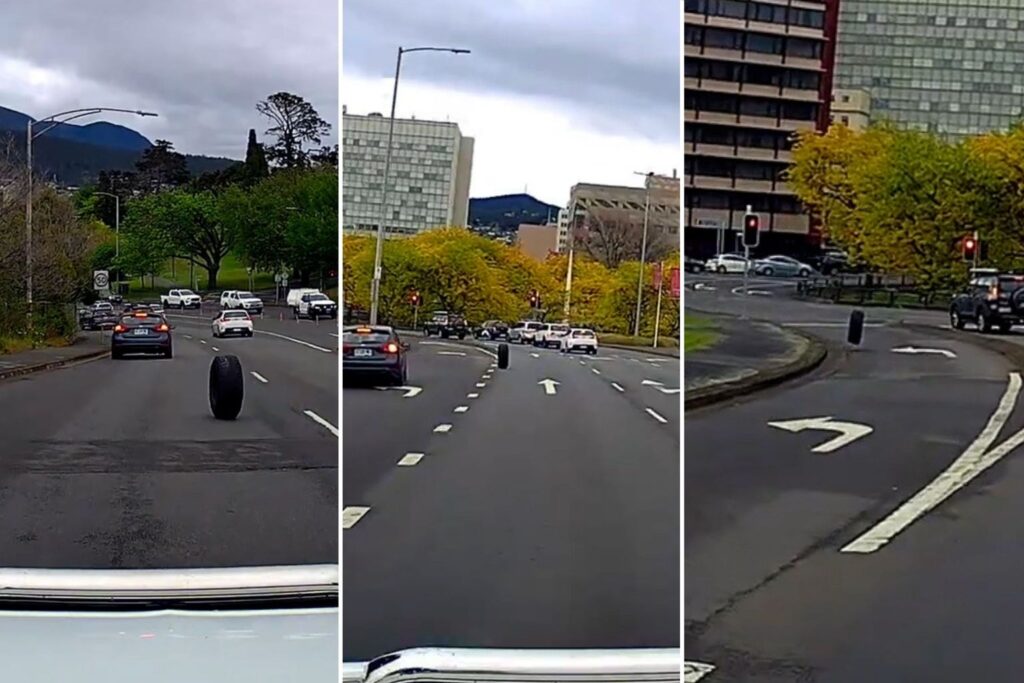 A runaway tyre rolling at high speed down one of Hobart’s busiest streets in peak-hour traffic has sparked concern from police.