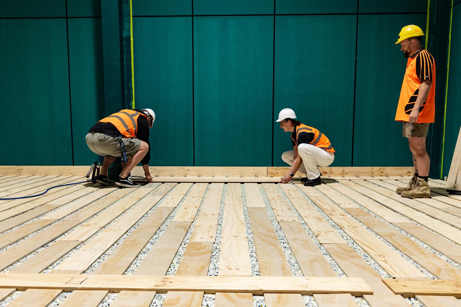 The Tasmania JackJumpers and Jewels are one step closer to having what they say will be the best training facility in Australian basketball, with the first section of court flooring laid at their new high-performance centre in Kingston on Monday.