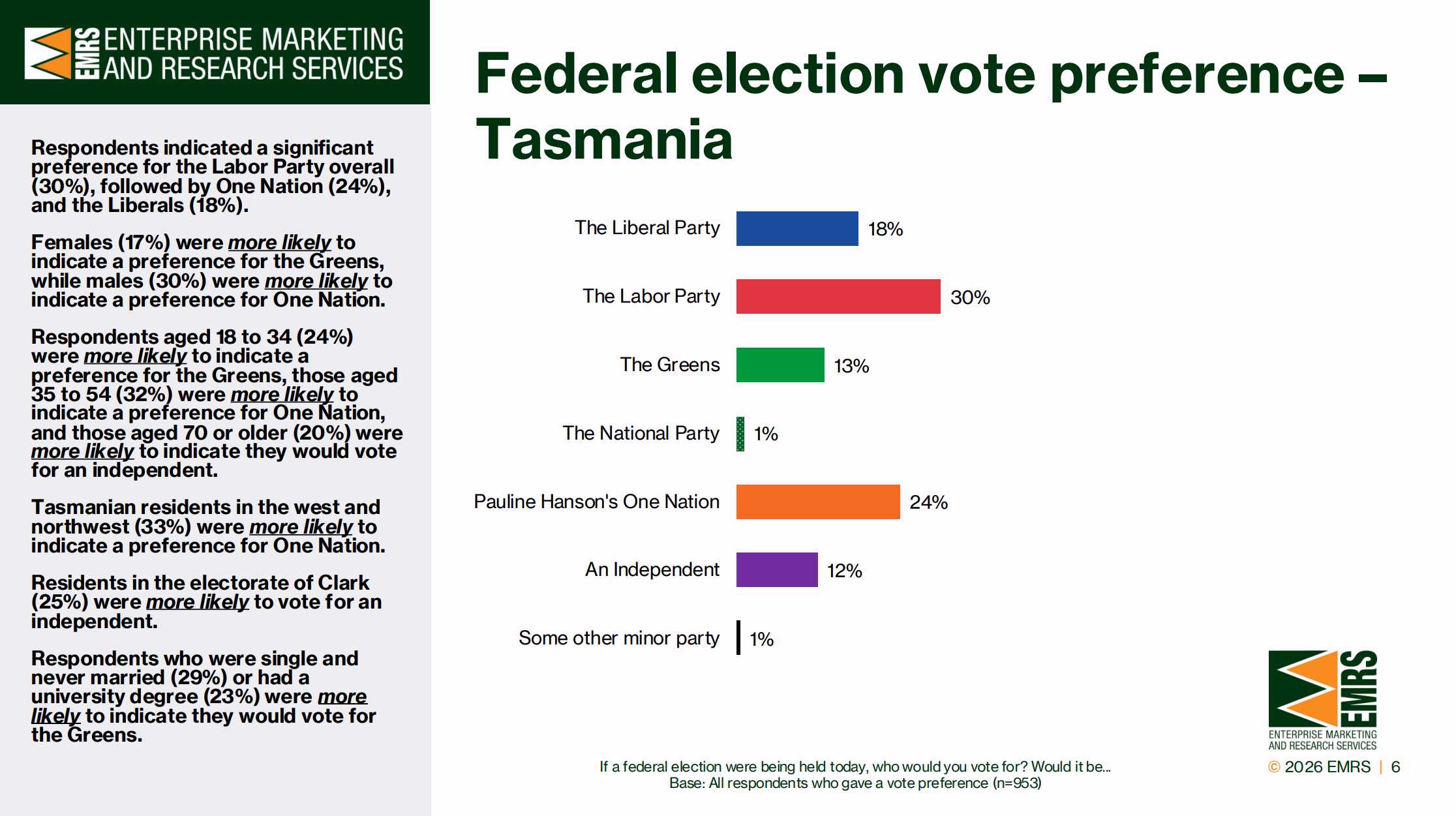 One Nation has surged to 24% support in Tasmania, placing it ahead of the Liberal Party on 18%, according to EMRS federal voter intention polling released today.