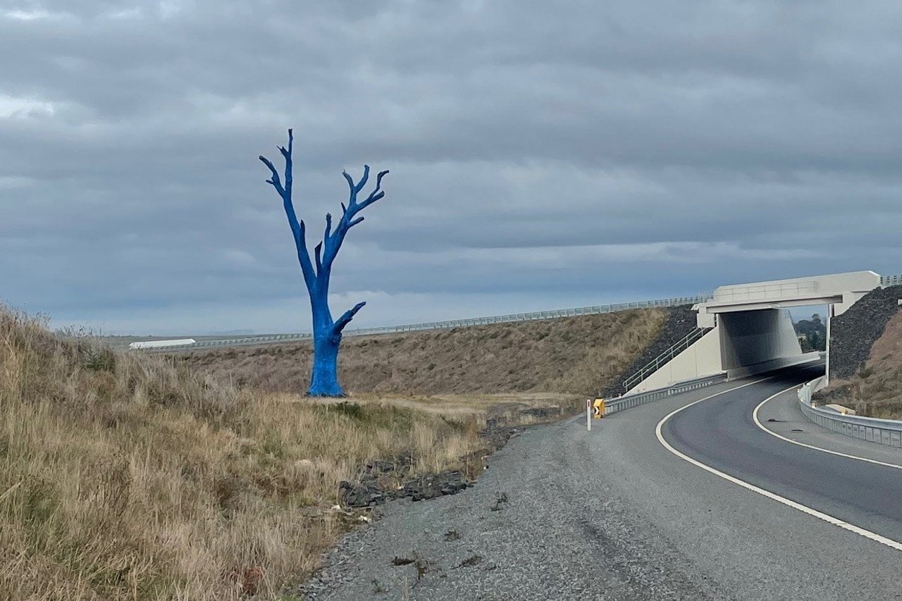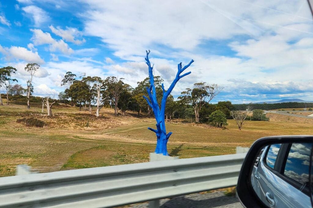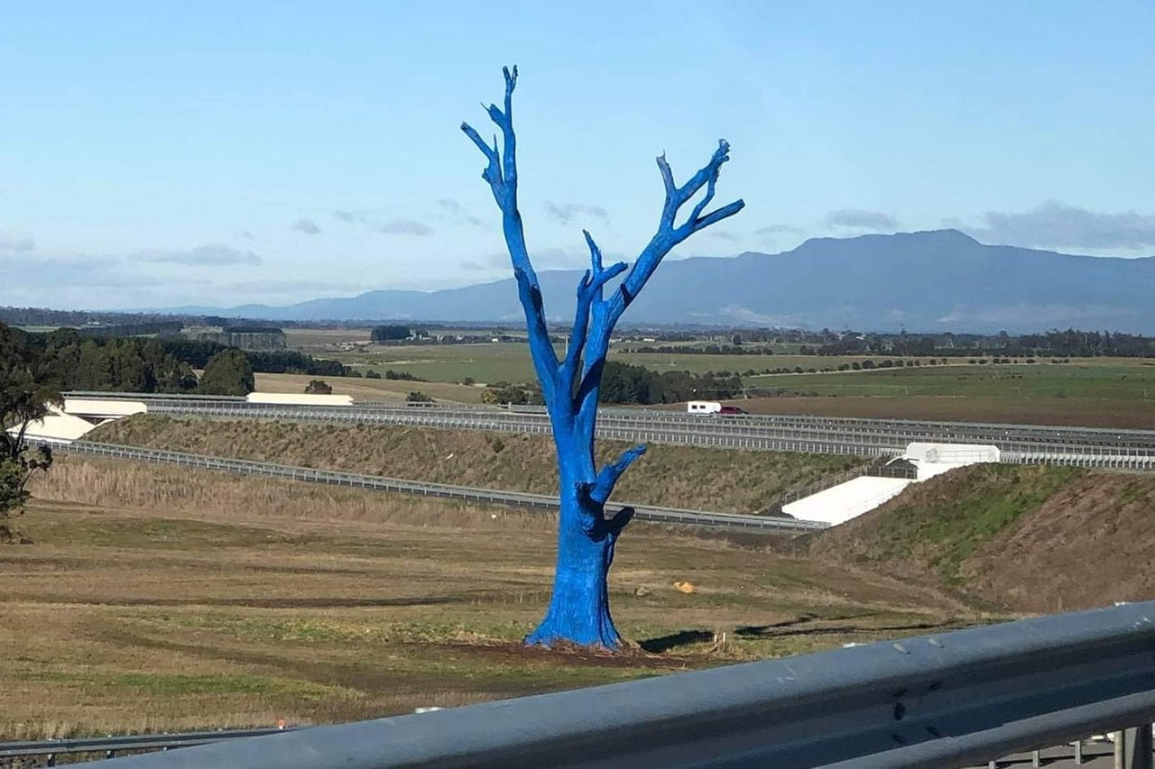The dead gum tree was painted bright blue in May 2021 as part of the national Blue Tree Project, which aims to spark conversations about mental health and reduce stigma around mental illness.