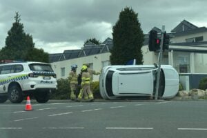 Car rolls onto side, wedges against traffic light
