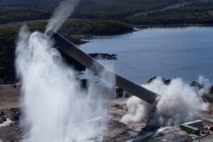 The 110-metre chimney stack was toppled using 41 kilograms of explosives