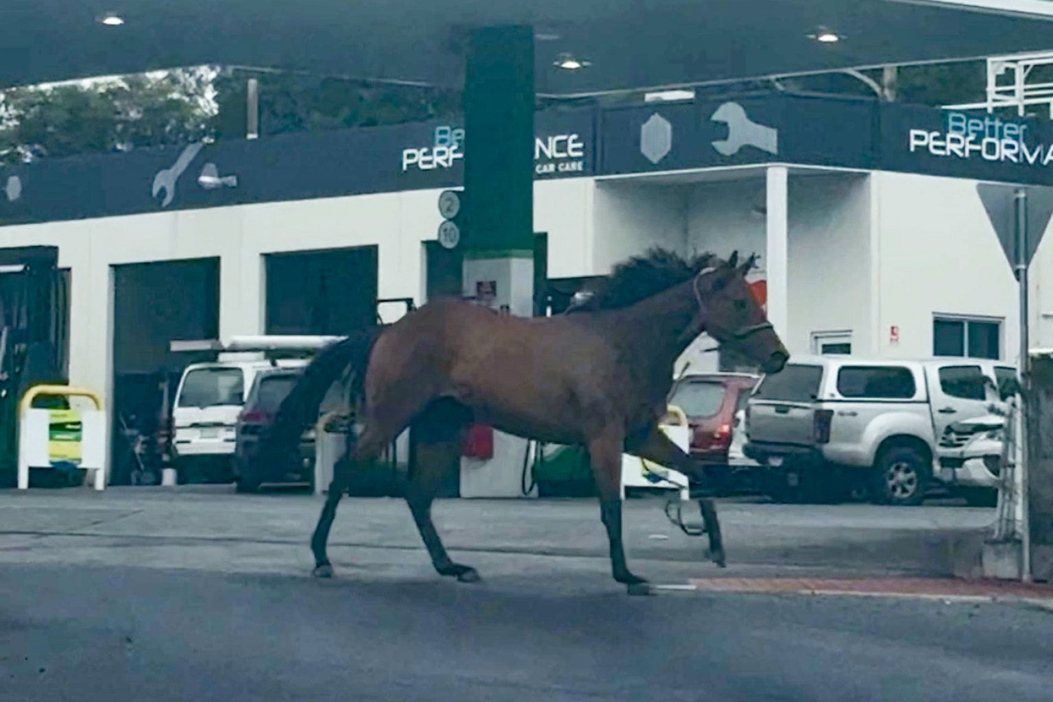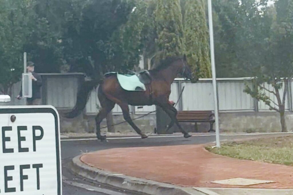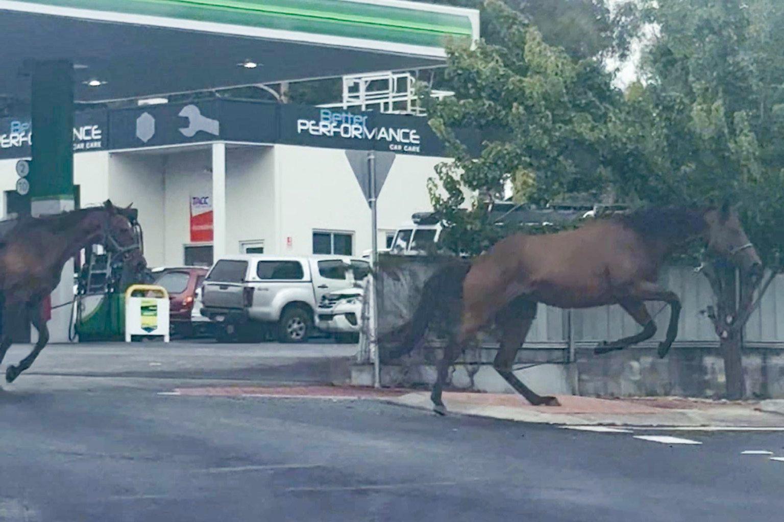 Footage captured the dramatic scene around 12:30pm as the horses bolted down the Channel Highway and around the roundabout near the BP service station, with their lead ropes trailing behind them.