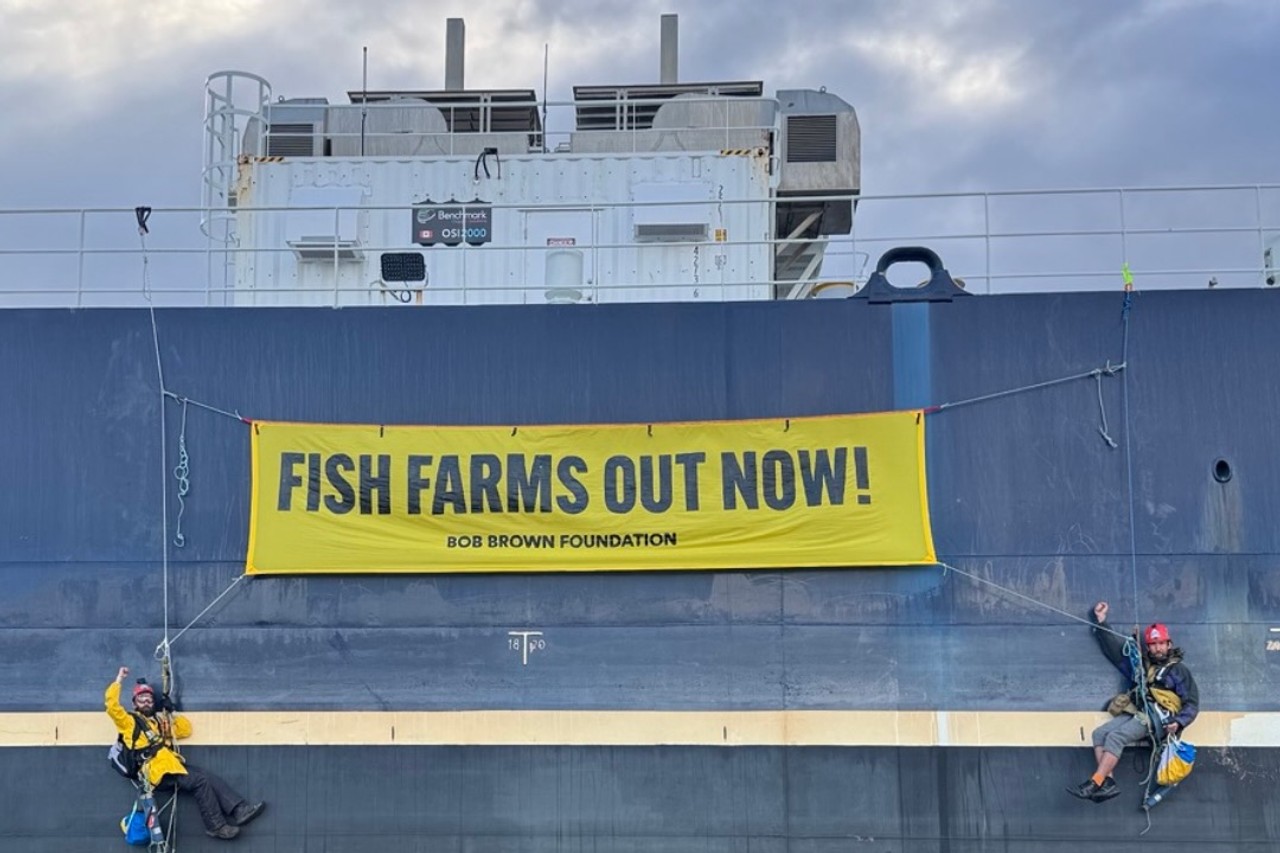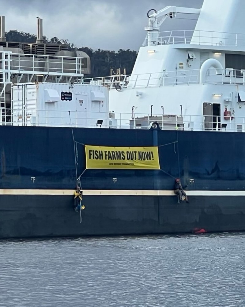The vessel – billed as the world’s largest fish-farming wellboat – was boarded by Bob Brown Foundation activists, who unfurled a yellow banner reading “Fish Farms Out Now”.