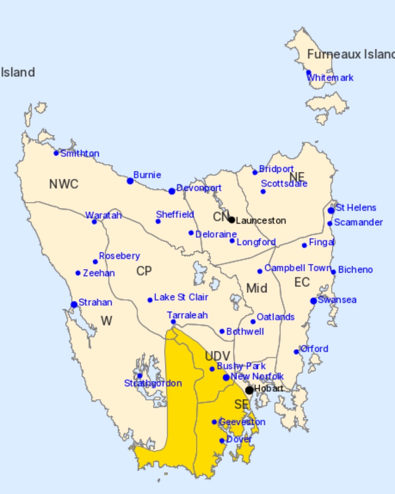 The weather bureau predicts the winds will impact New Norfolk, Bushy Park, Geeveston, Dover and Huonville.