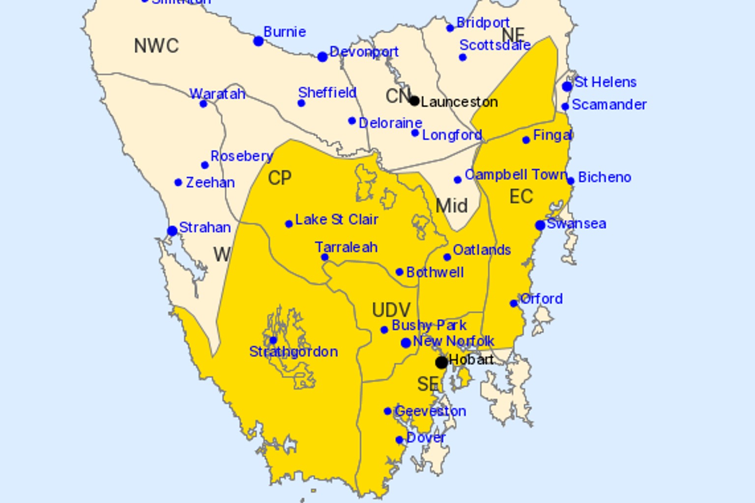 The warning, issued Saturday afternoon, covers the Upper Derwent Valley, South East, East Coast, Central Plateau, Midlands and parts of Western and North East Forecast Districts.