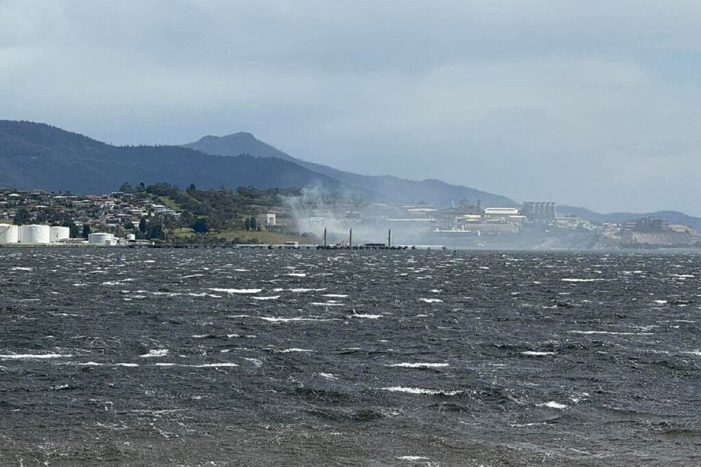 A bushfire near the New Town Bay Golf Course is sending smoke drifting across the River Derwent as strong winds sweep through Hobart today.