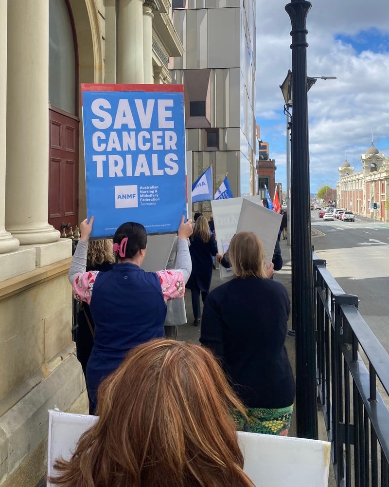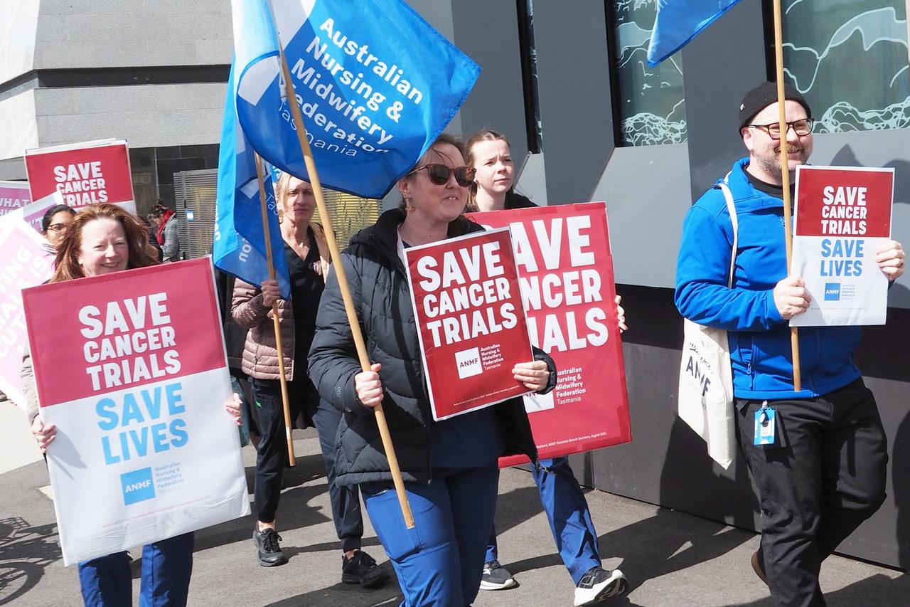 Health union members have walked off the job at the Royal Hobart Hospital in protest over what they say are planned cuts to the state’s cancer clinical trials unit.