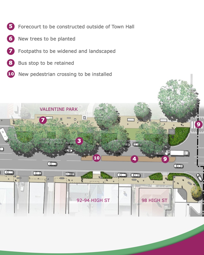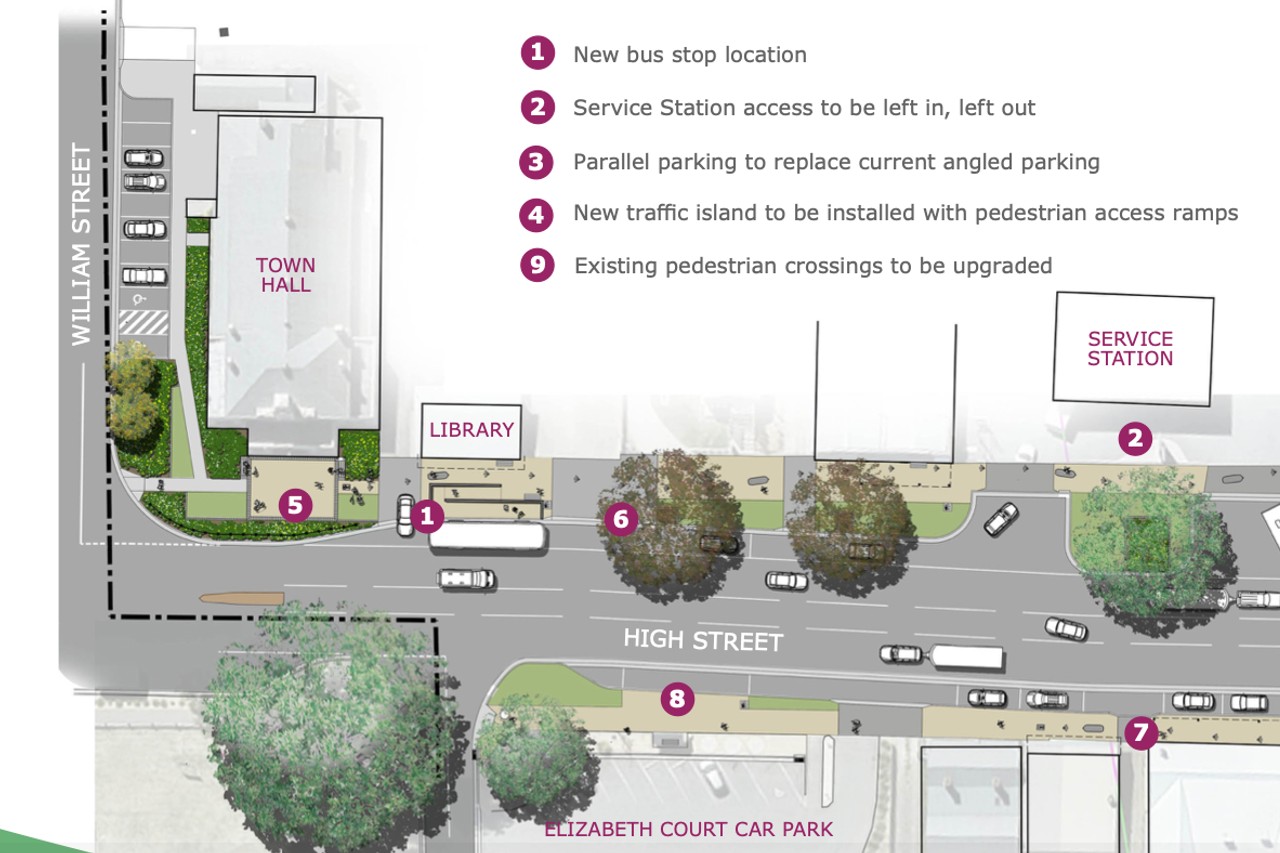 The redevelopment includes widened footpaths on both sides of Main Street, additional outdoor seating, new landscaping and interpretation signage, relocated bus stops and upgraded parking areas and pedestrian crossings.