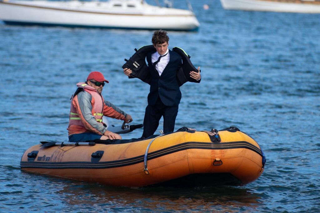 Images from the ABC show Rory Alexander making the journey across the water from the fire-affected Stieglitz area, where his formal suit remained packed away at home behind roadblocks.