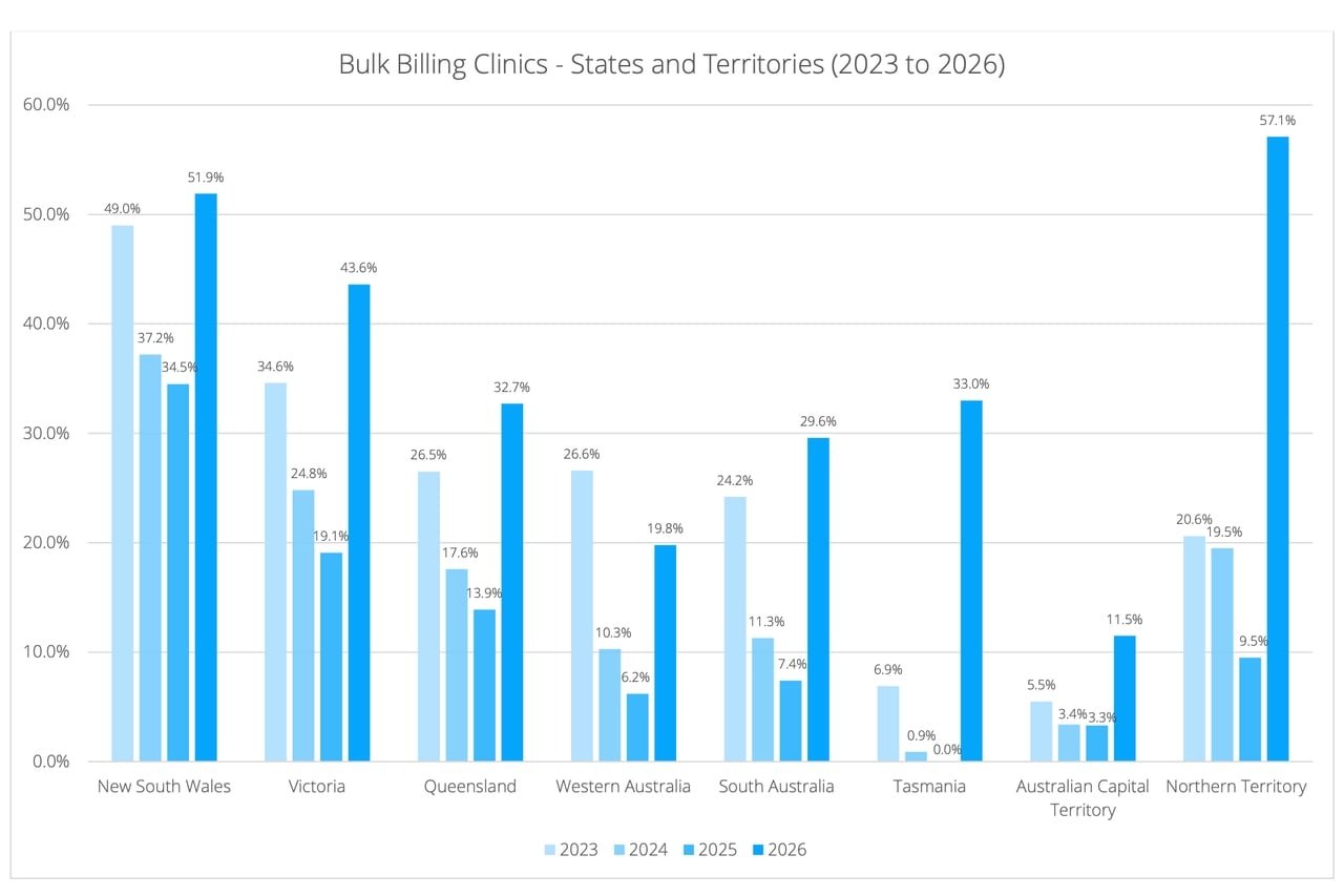 New South Wales and the Northern Territory lead the country, with more than half of clinics in each jurisdiction now bulk-billing all patients.