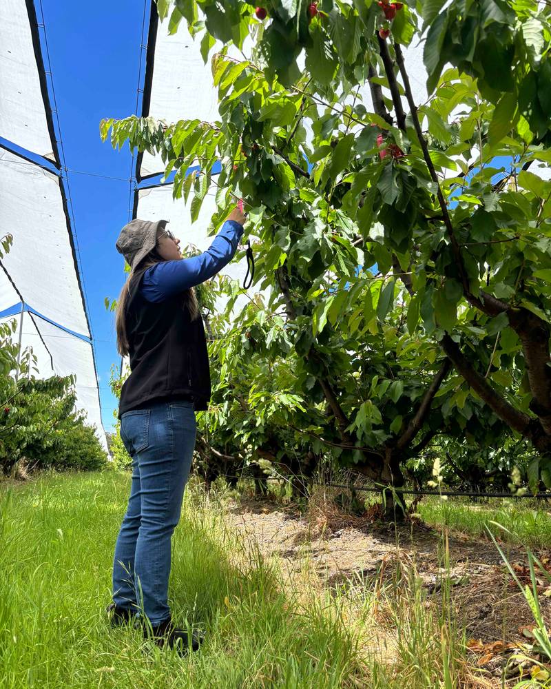 She is looking at how rain covers change conditions inside orchards and what that means for tree growth and fruit quality.