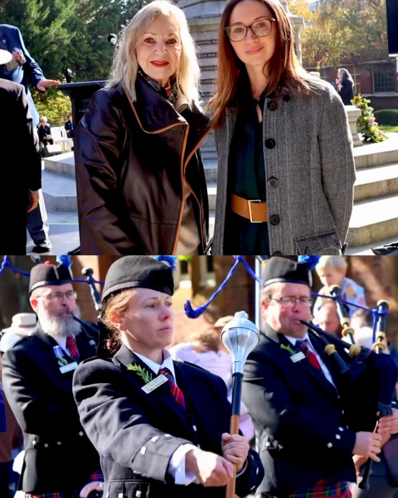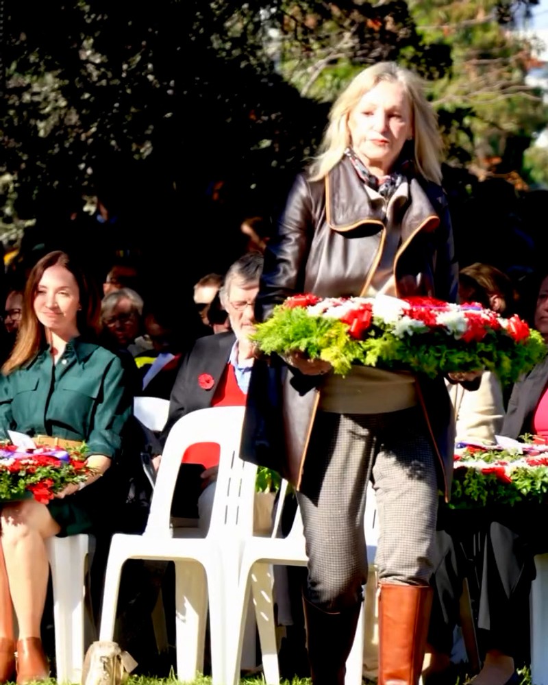 Pictured surrounded by the music and visual effects showed people paying tribute at the ANZAC Day ceremony, along with images of Polley holding a ‘Lest We Forget’ wreath next to Federal Bass MP Jess Teesdale.