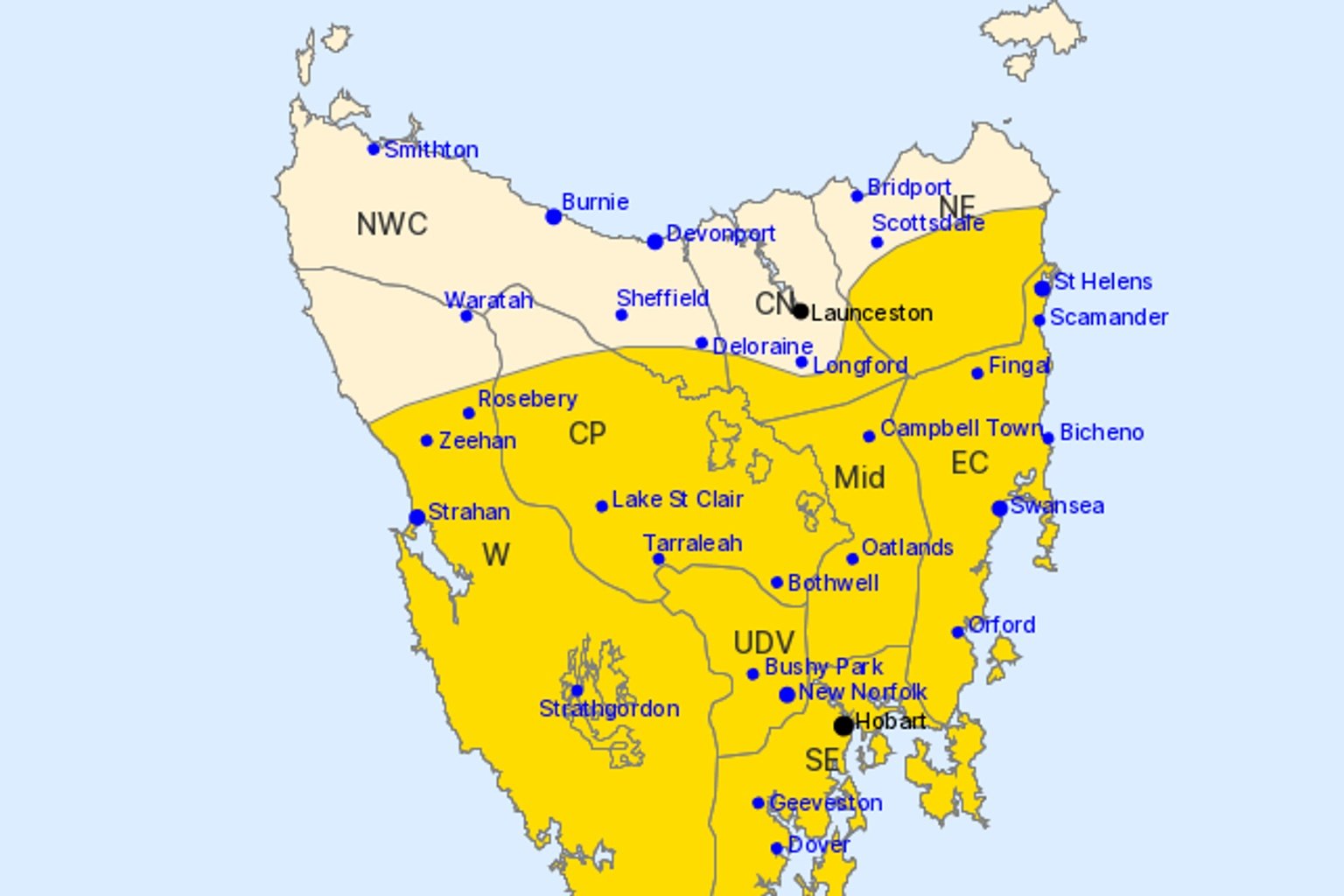 The warning covers the Western, Upper Derwent Valley, South East, East Coast, Central Plateau and Midlands districts, as well as parts of the North East, North West Coast and Central North regions.