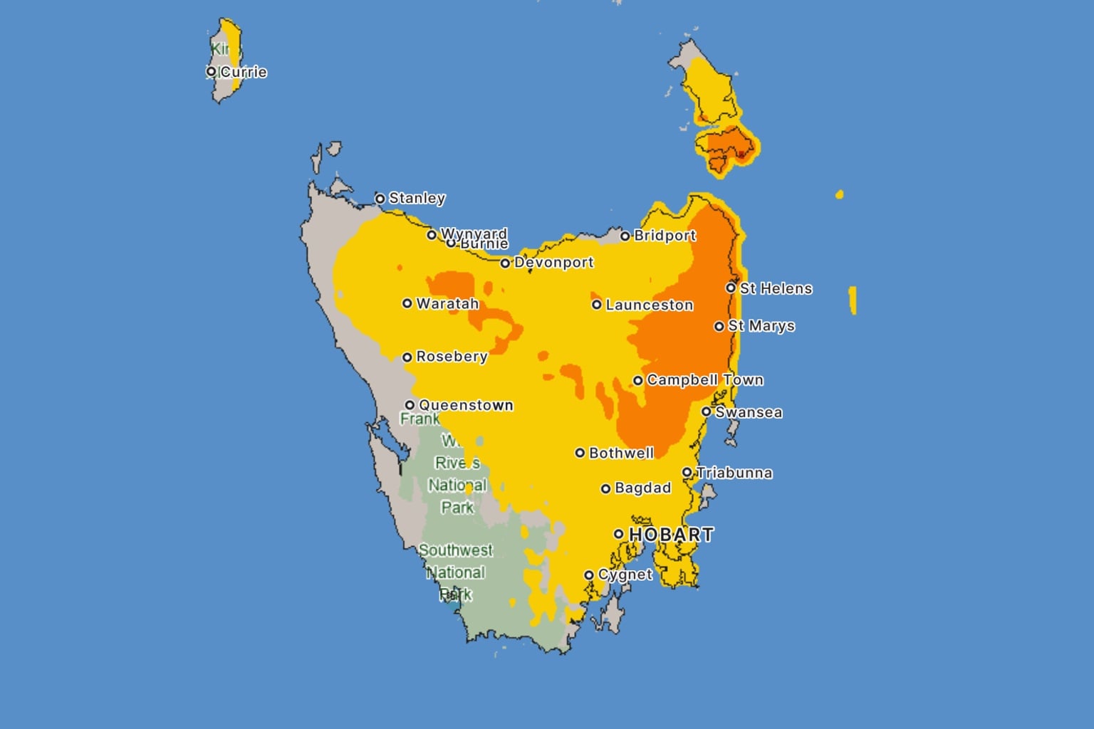The Bureau of Meteorology has declared severe heatwave conditions for much of northern Tasmania, with an extreme heatwave warning in place for the Furneaux Islands.