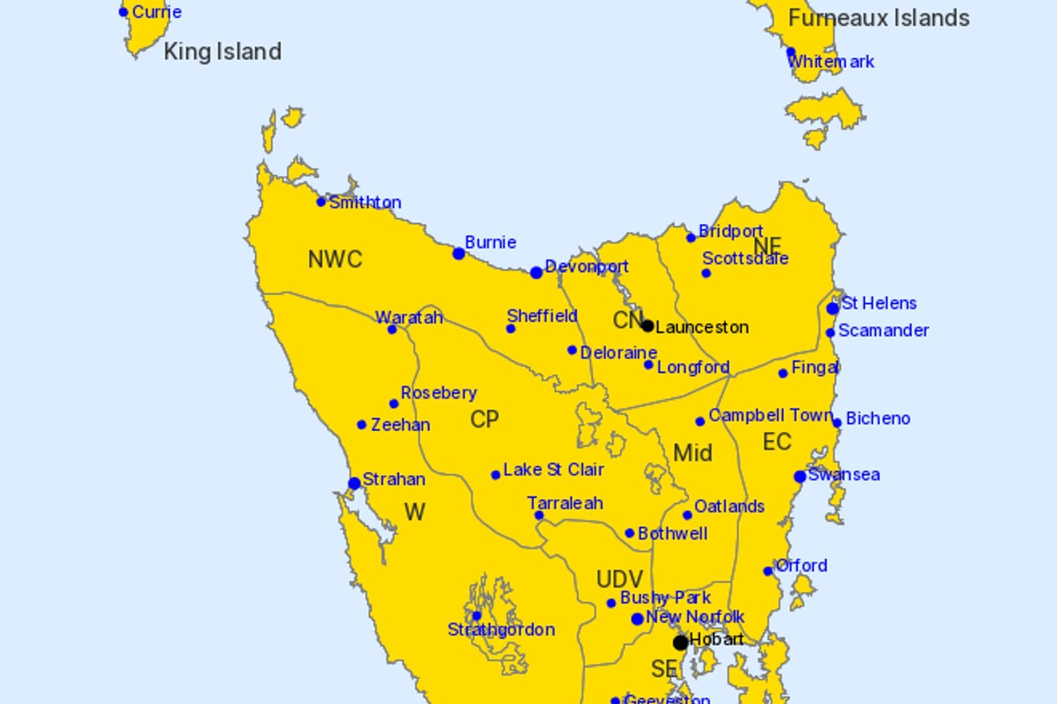 Northern coastal Tasmania and the Furneaux Islands can expect damaging winds averaging 60 to 70km/h with peak gusts around 110km/h, starting around sunrise and spreading east throughout the day.